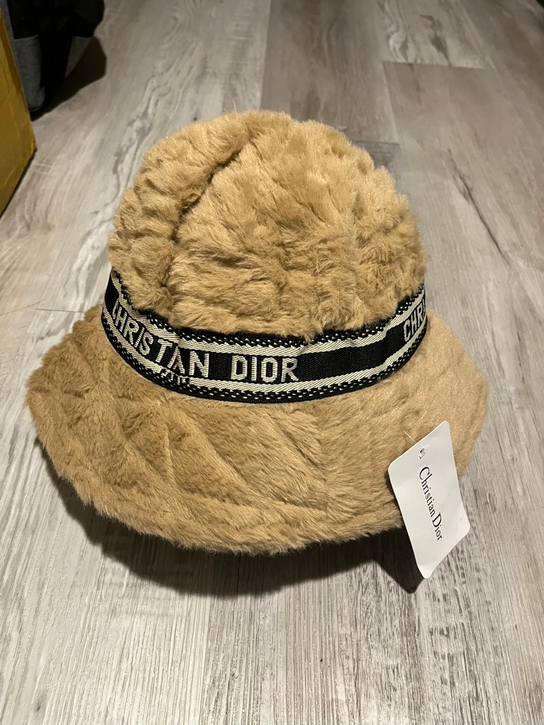 Two Christian Dior bucket hats. One black, one tan. Soft faux fur. Brand label visible. Stylish and warm.