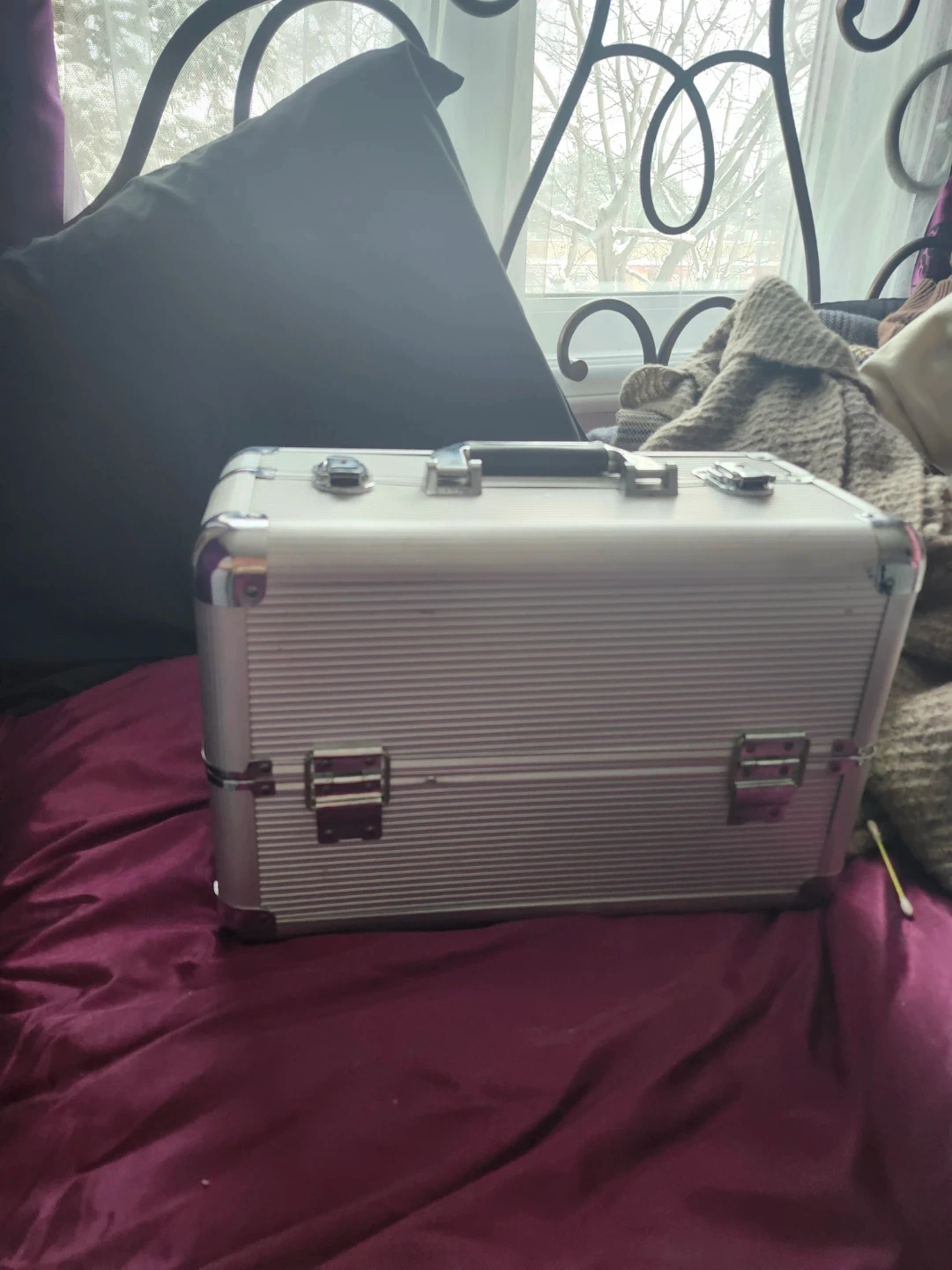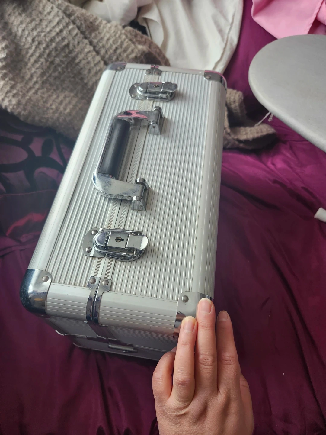 This is a silver aluminium makeup train case with multiple compartments and pull-out trays. It's great for organizing cosmetics and beauty supplies. The case features a sturdy handle and secure latches for travel. $5