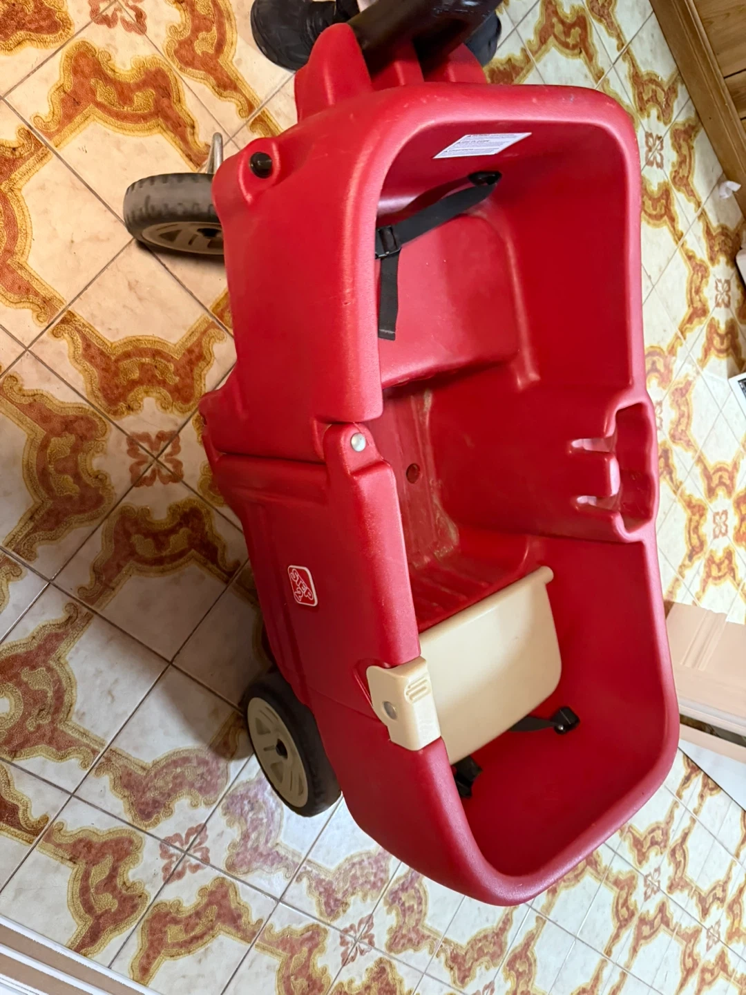 This is a red Step2 wagon with a beige insert. It has a seatbelt for safety. Great for toddlers and young kids to ride in or haul toys!