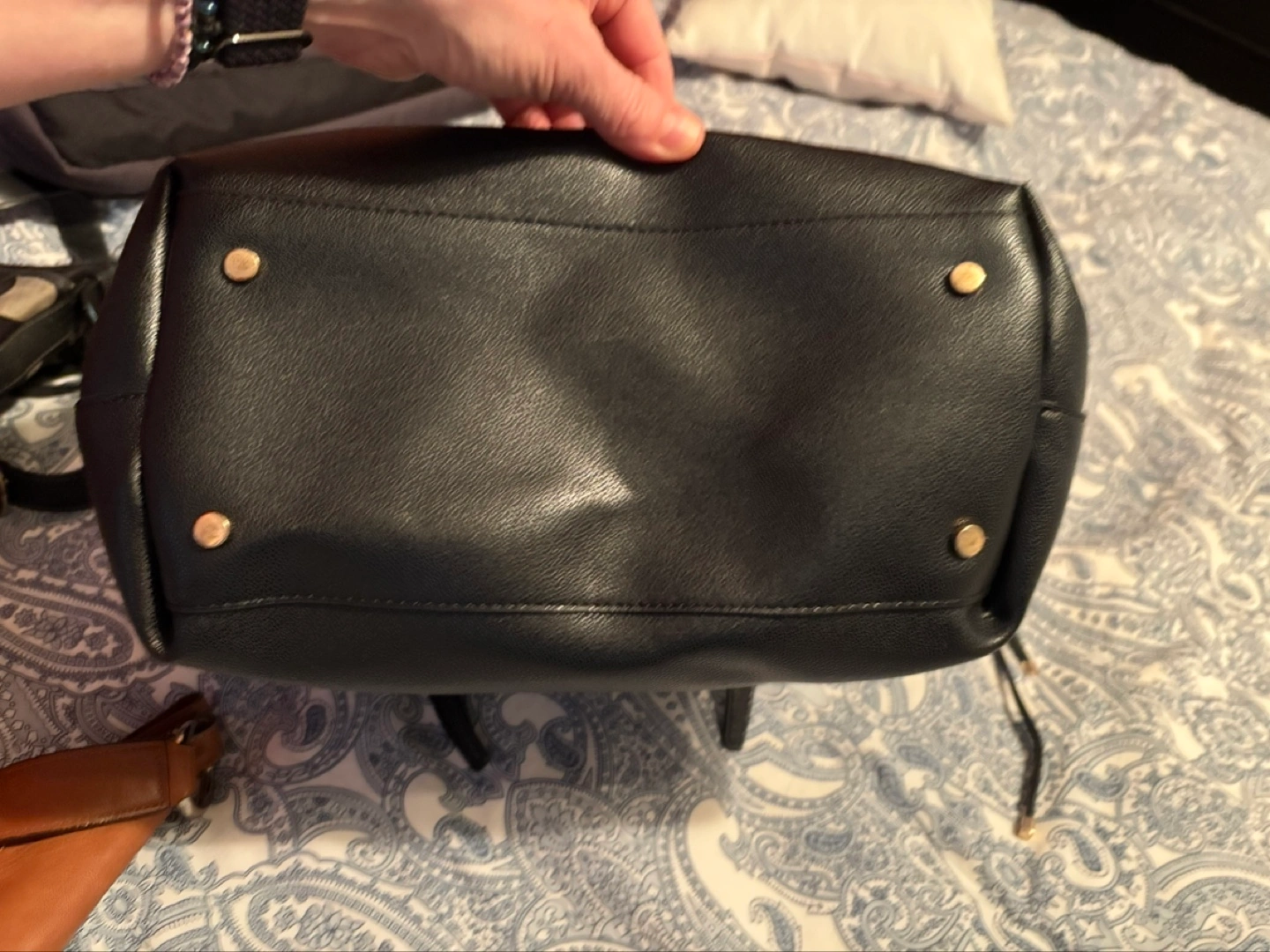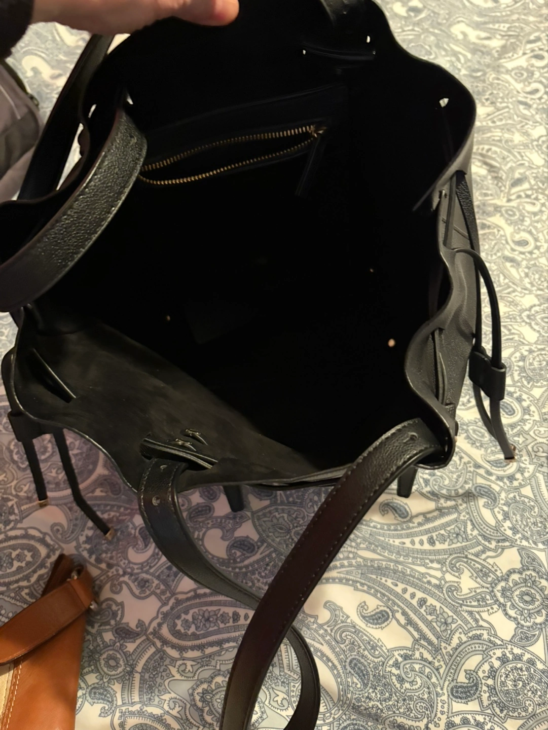Large black bucket bag. Drawstring closure. Top handles. Interior zipper pocket. Gold-toned hardware.