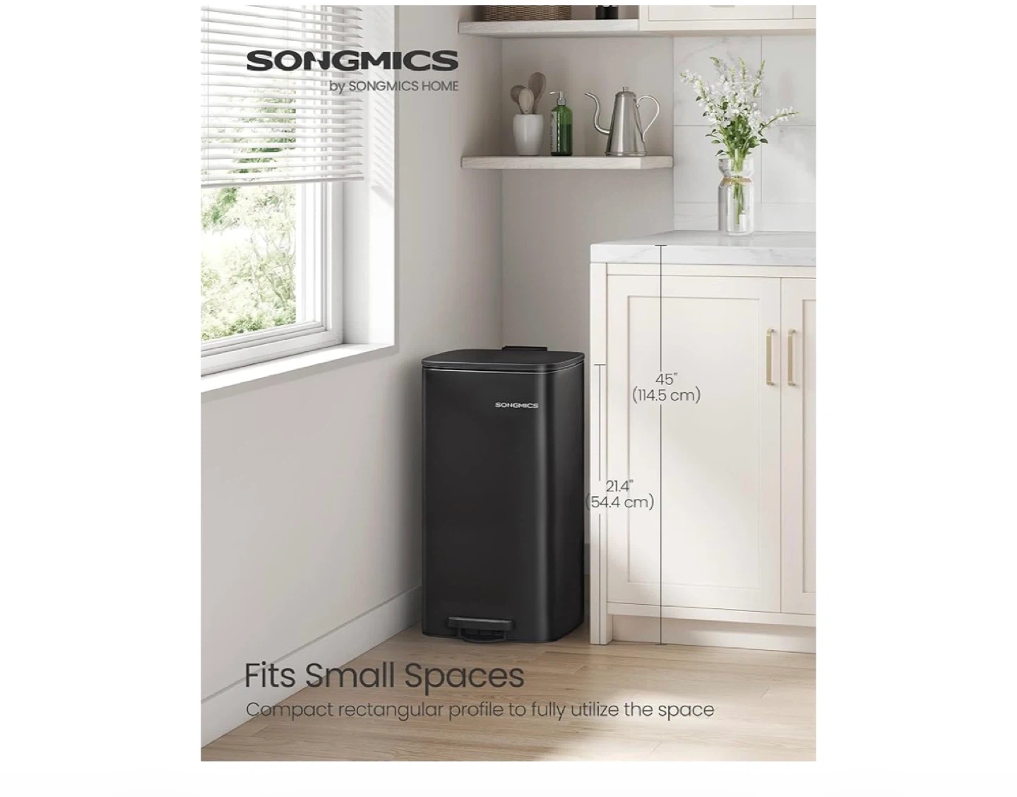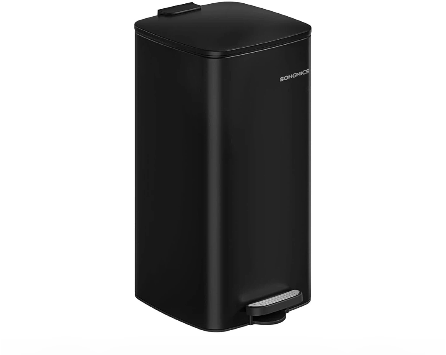 8 gallon (30L) rectangular step trash can in black. It features a soft-close lid and a removable inner bucket for easy cleaning. The compact design fits well in small spaces.