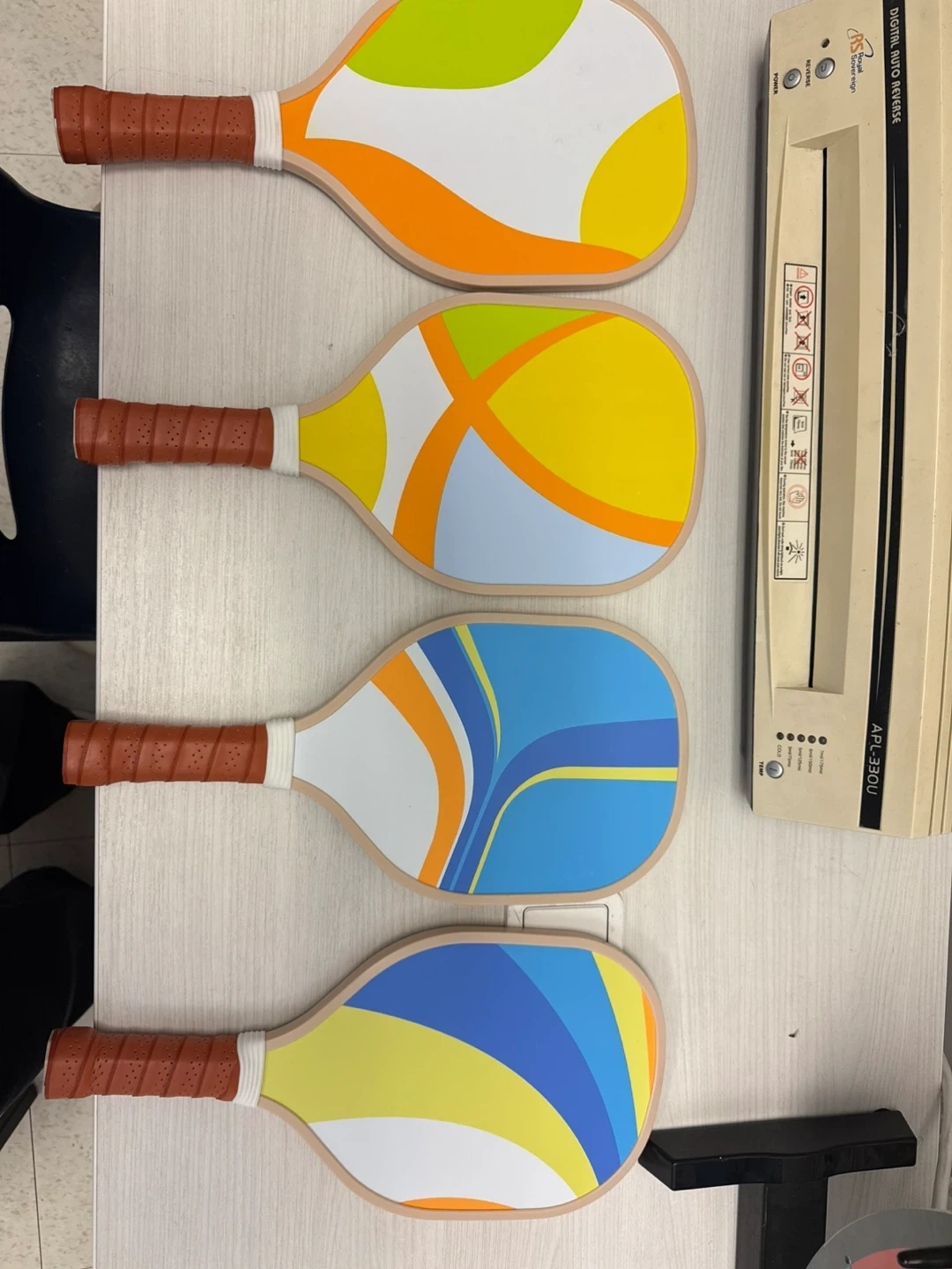 Set of SPRYPALS pickleball paddles. Includes one green, one yellow, one blue, and one pink paddle. Also includes a mesh bag. Paddles feature wood construction with grip handles.