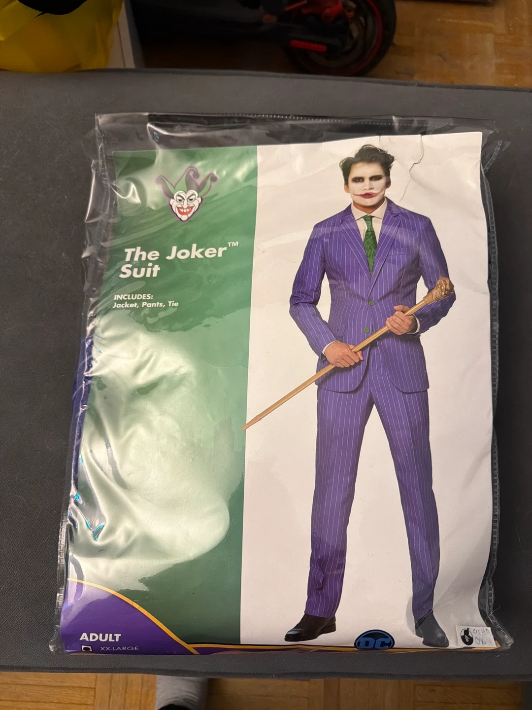 This is an adult The Joker suit costume in XX-Large. It includes a jacket, pants, and tie. Perfect for Halloween or costume parties! Used once