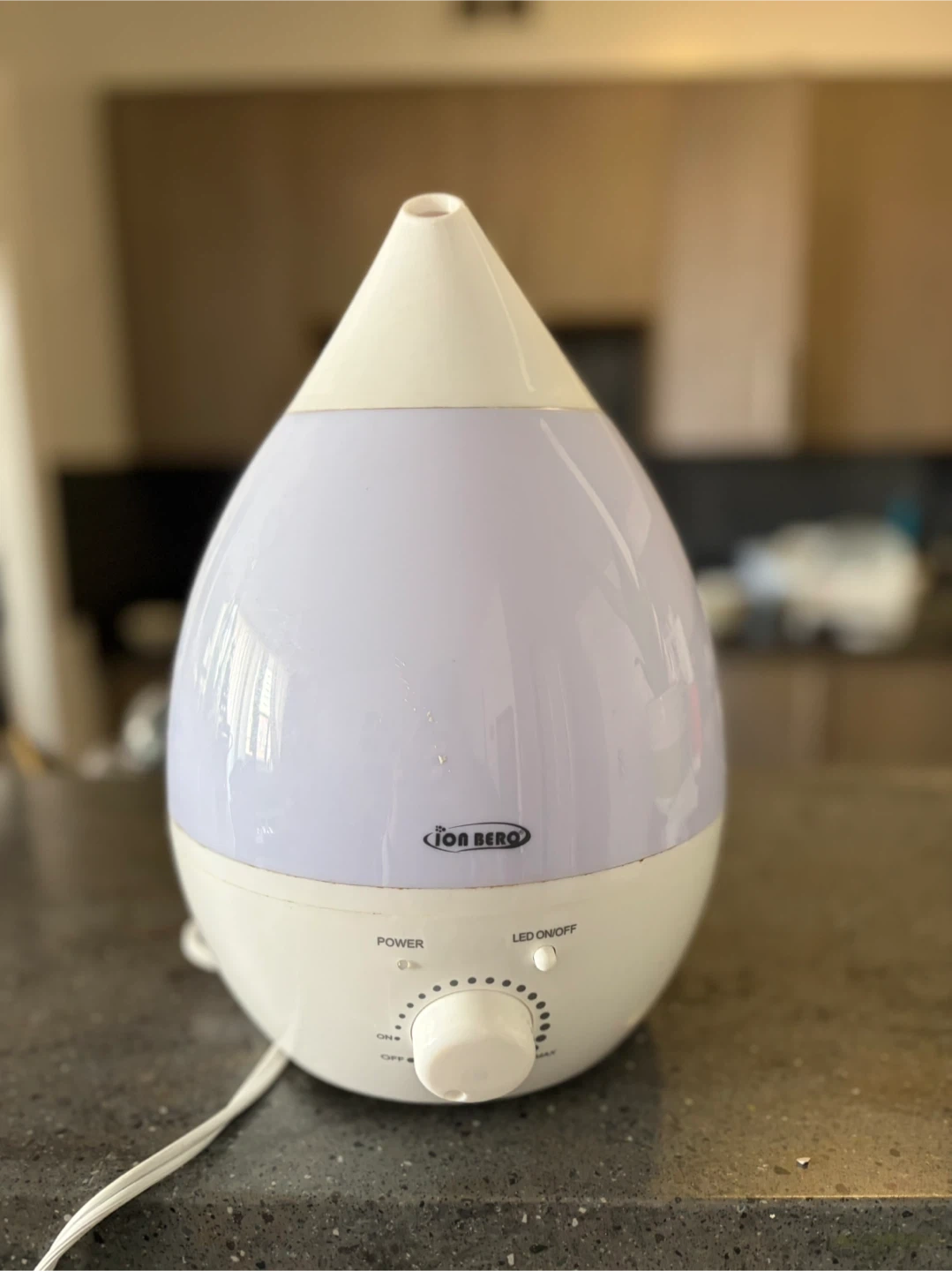 This JON BERO ultrasonic humidifier helps to add moisture to the air. It has a power dial and an LED on/off switch. The tank has a soft purple glow when the LED is on.