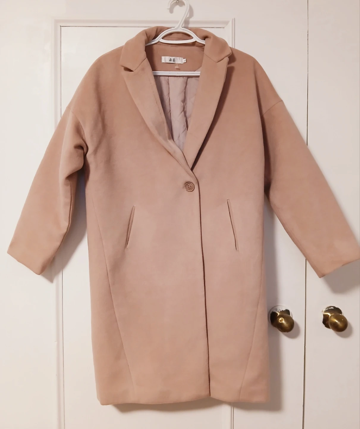 A dusty rose pink one button v-neck coat from Duorui. Size Medium. Available for pick up in Meadowvale area, closest intersection Brittania and Glen Erin