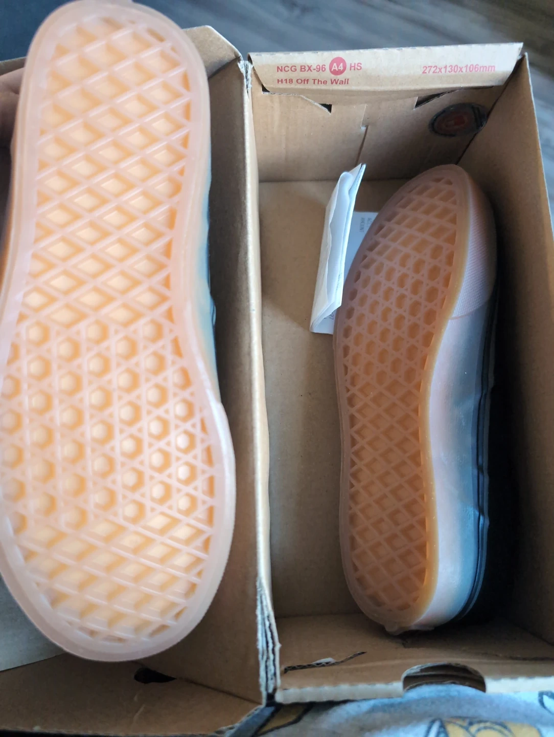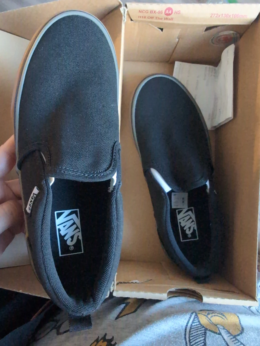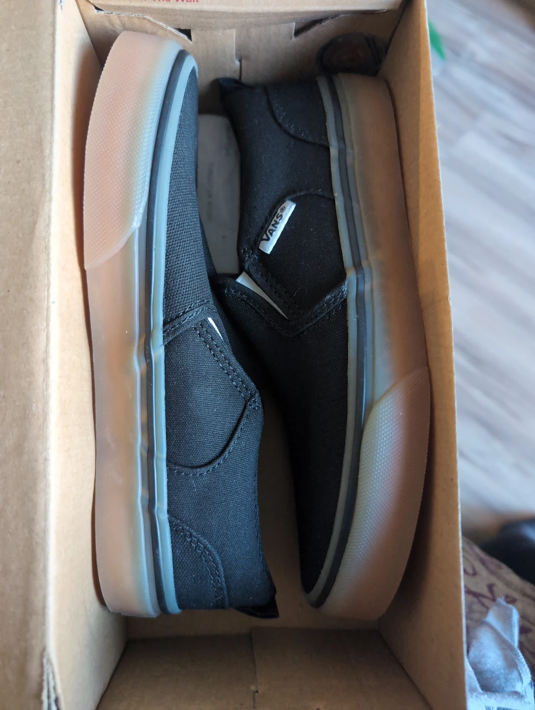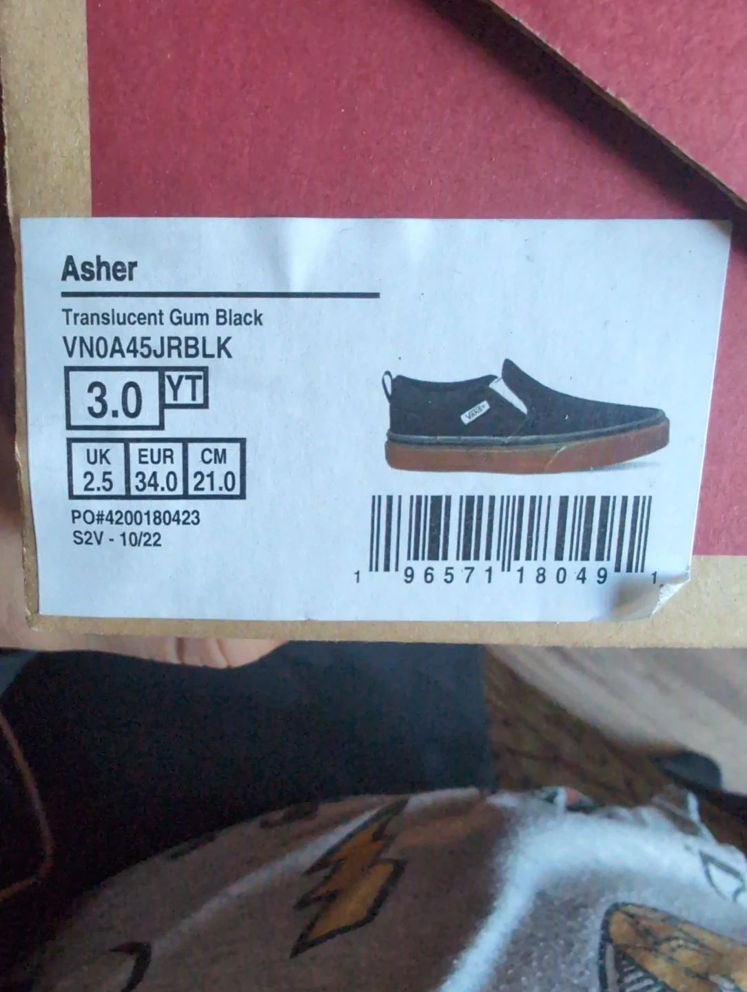 Vans Asher slip-on shoes in Translucent Gum Black. These are size 3 Youth. They feature a durable canvas upper and the classic Vans waffle sole. Includes original box.