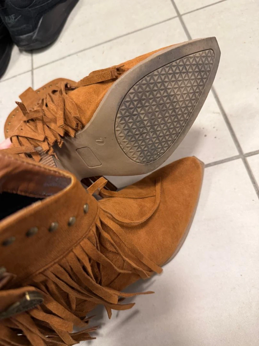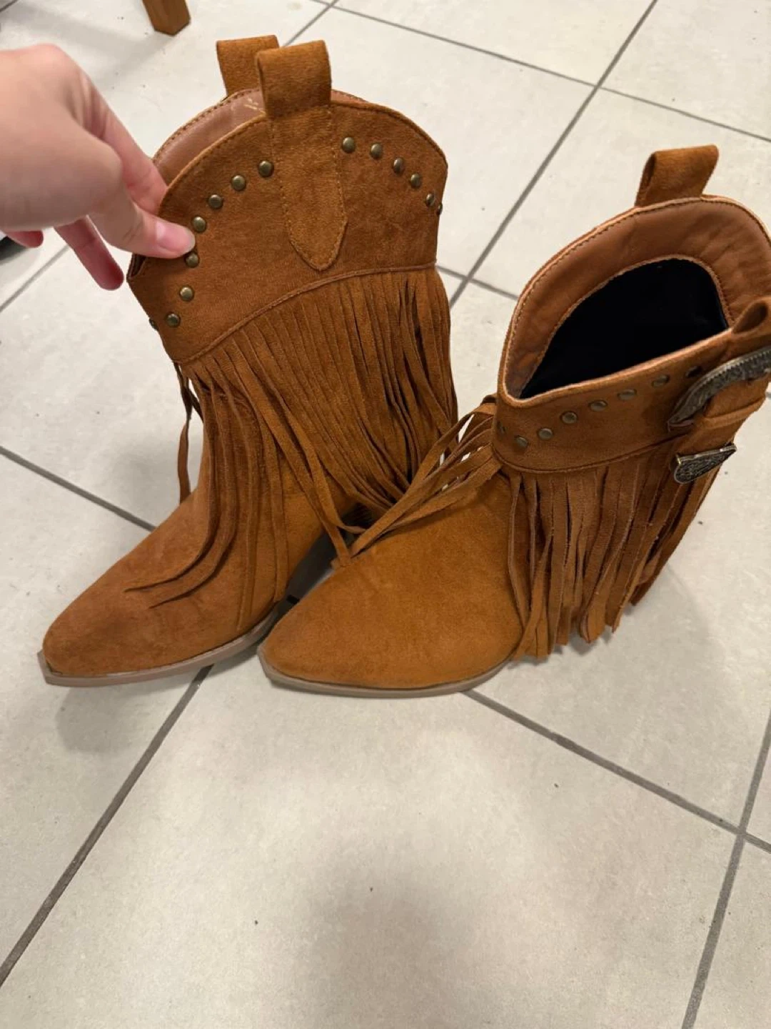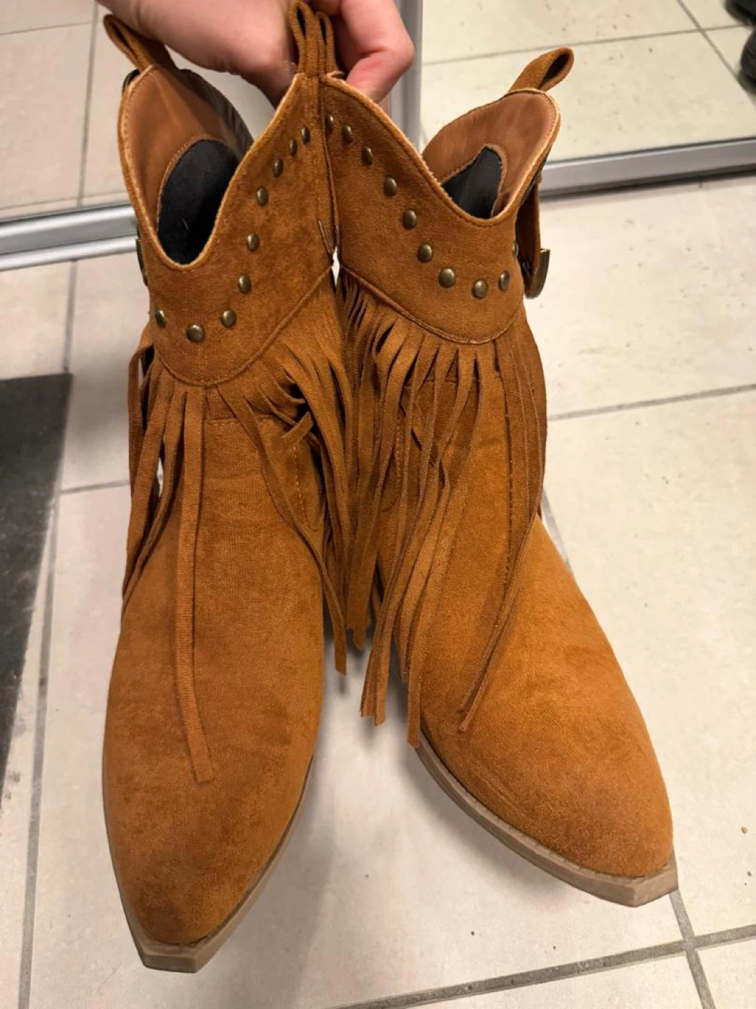 Used once but great condition stylish brown ankle boots with fringe and stud detailing. Get your country fit on! US7