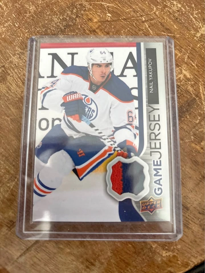 2014-15 Upper Deck Series One Game Jersey — Nail Yakupov (Edmonton Oilers). Features a game-used multicolor jersey patch with nice Oilers colors. Card is in excellent condition and has been kept protected in a sleeve and top loader. Great pickup for Oilers fans or jersey card collectors.