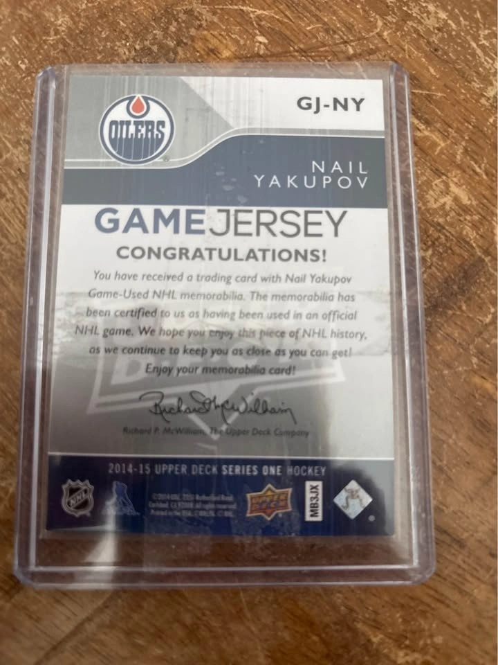 2014-15 Upper Deck Series One Game Jersey — Nail Yakupov (Edmonton Oilers). Features a game-used multicolor jersey patch with nice Oilers colors. Card is in excellent condition and has been kept protected in a sleeve and top loader. Great pickup for Oilers fans or jersey card collectors.