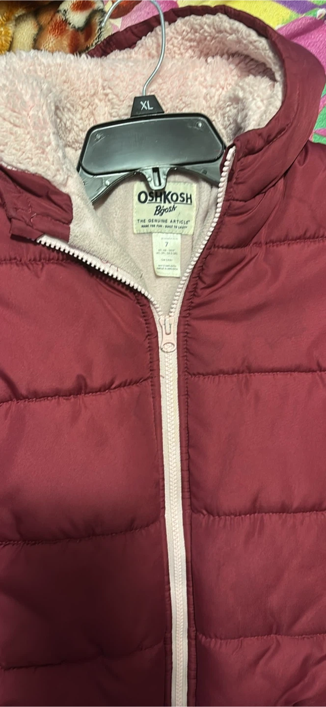 This OshKosh B'gosh puffer jacket is a size 7. It features a cozy sherpa lining inside the hood and body. The exterior is a classic quilted design in a deep red colour.