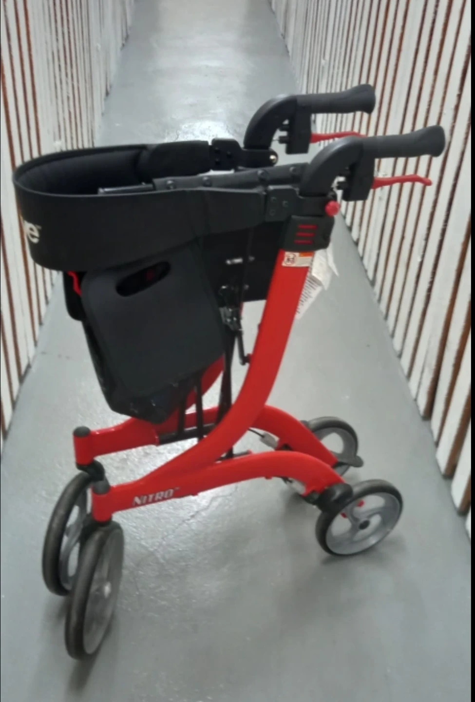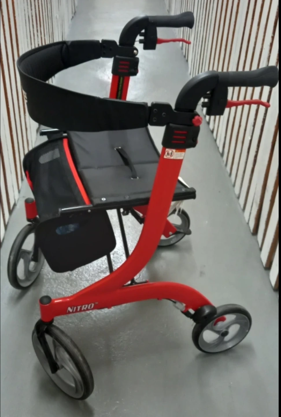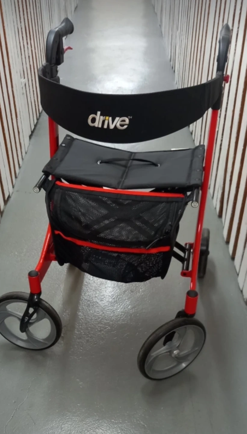 This red Drive Nitro rollator walker is a great mobility aid. It's equipped with a comfortable seat and a convenient basket for carrying items. This rollator is designed for ease of use and stability. It's perfect for individuals who need support while walking indoors or outdoors. It is kept in very clean and perfect condition.