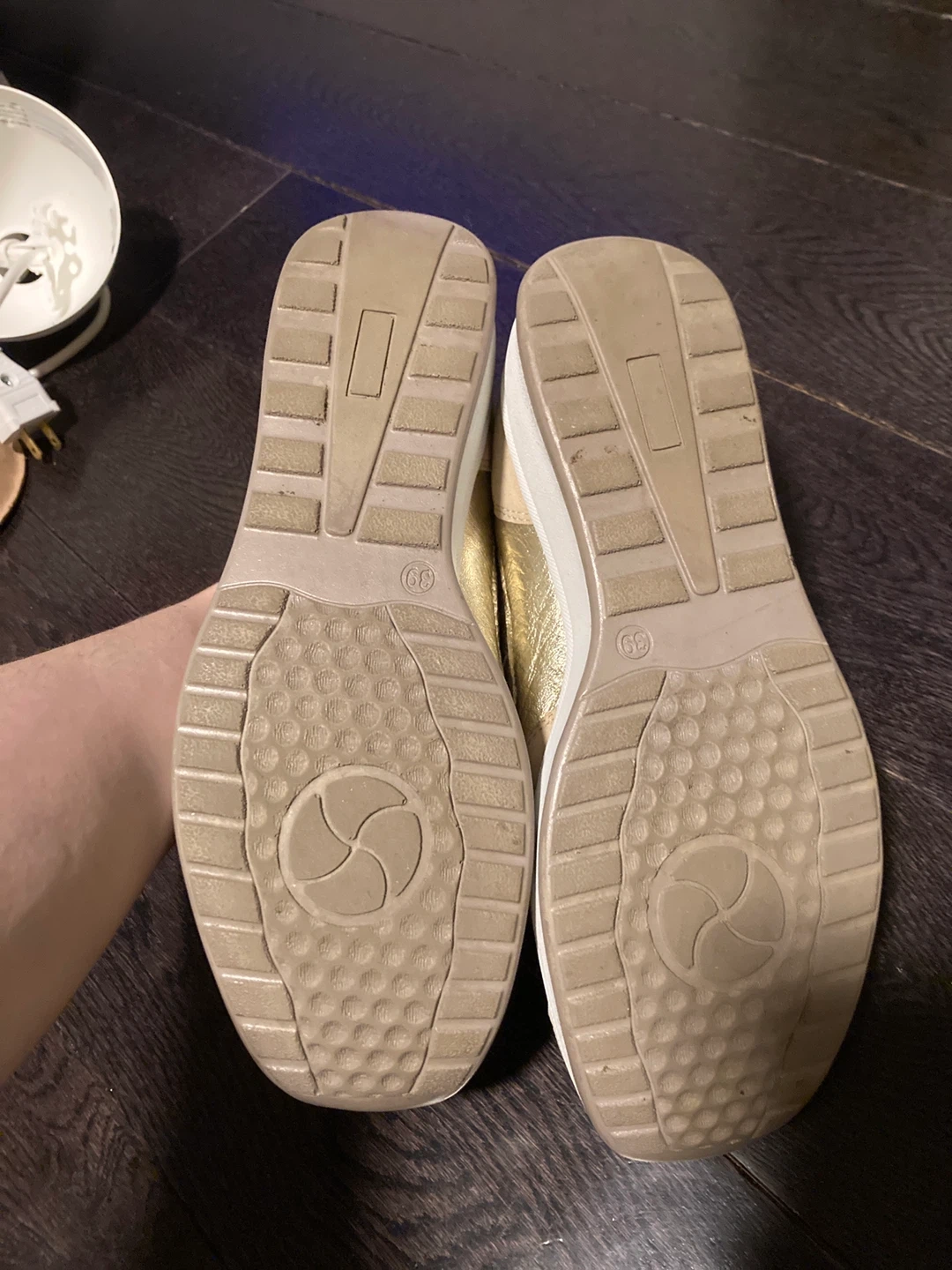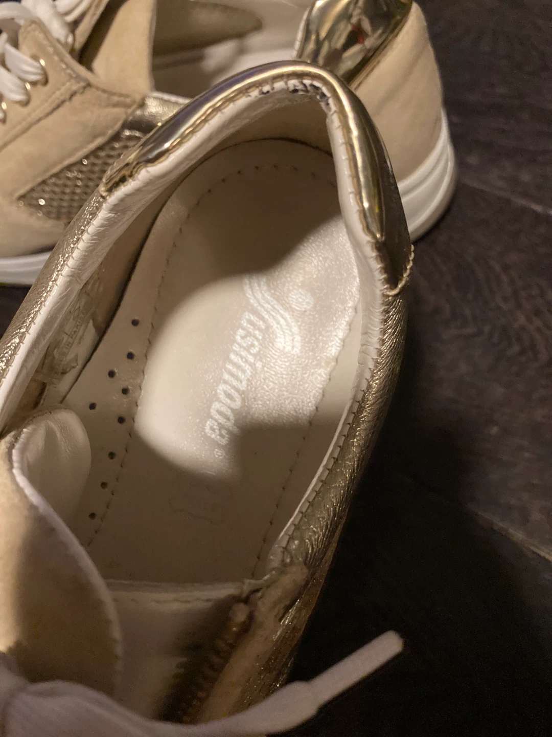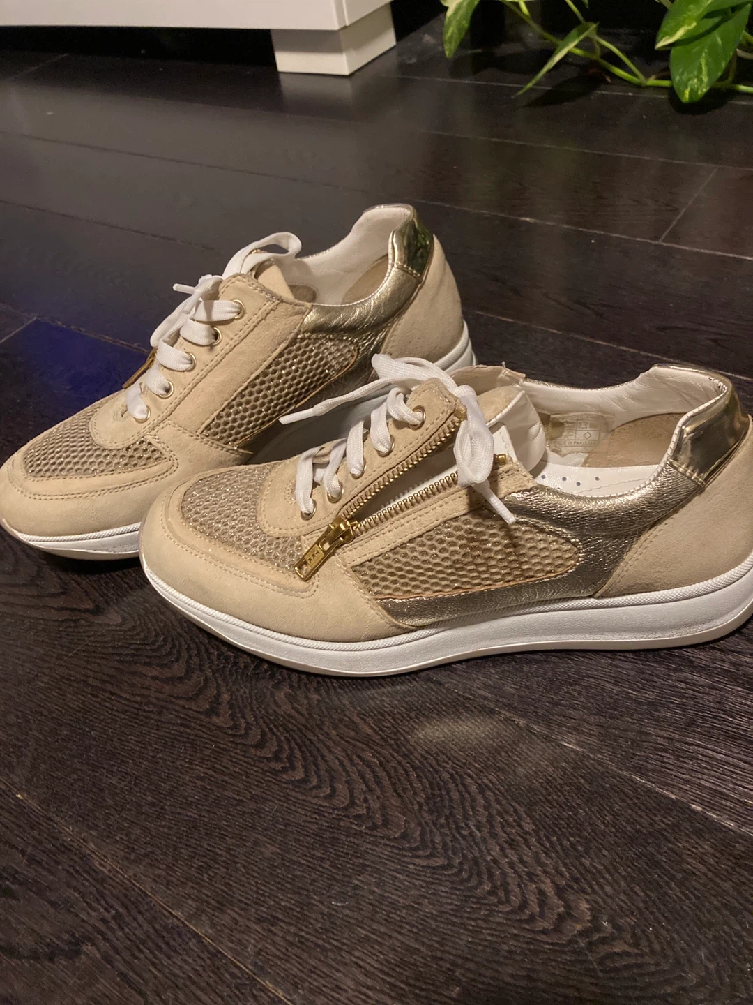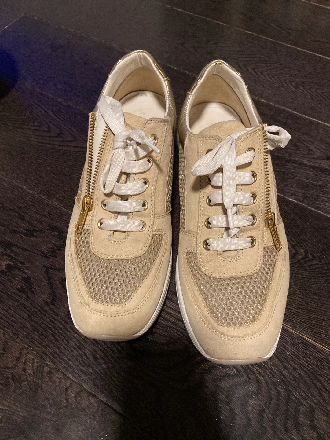 Susimoda sneakers in a beige and gold colourway. Features a lace-up front with a side zipper for easy on and off. Mesh and suede upper with metallic gold accents. Great condition/barely worn.