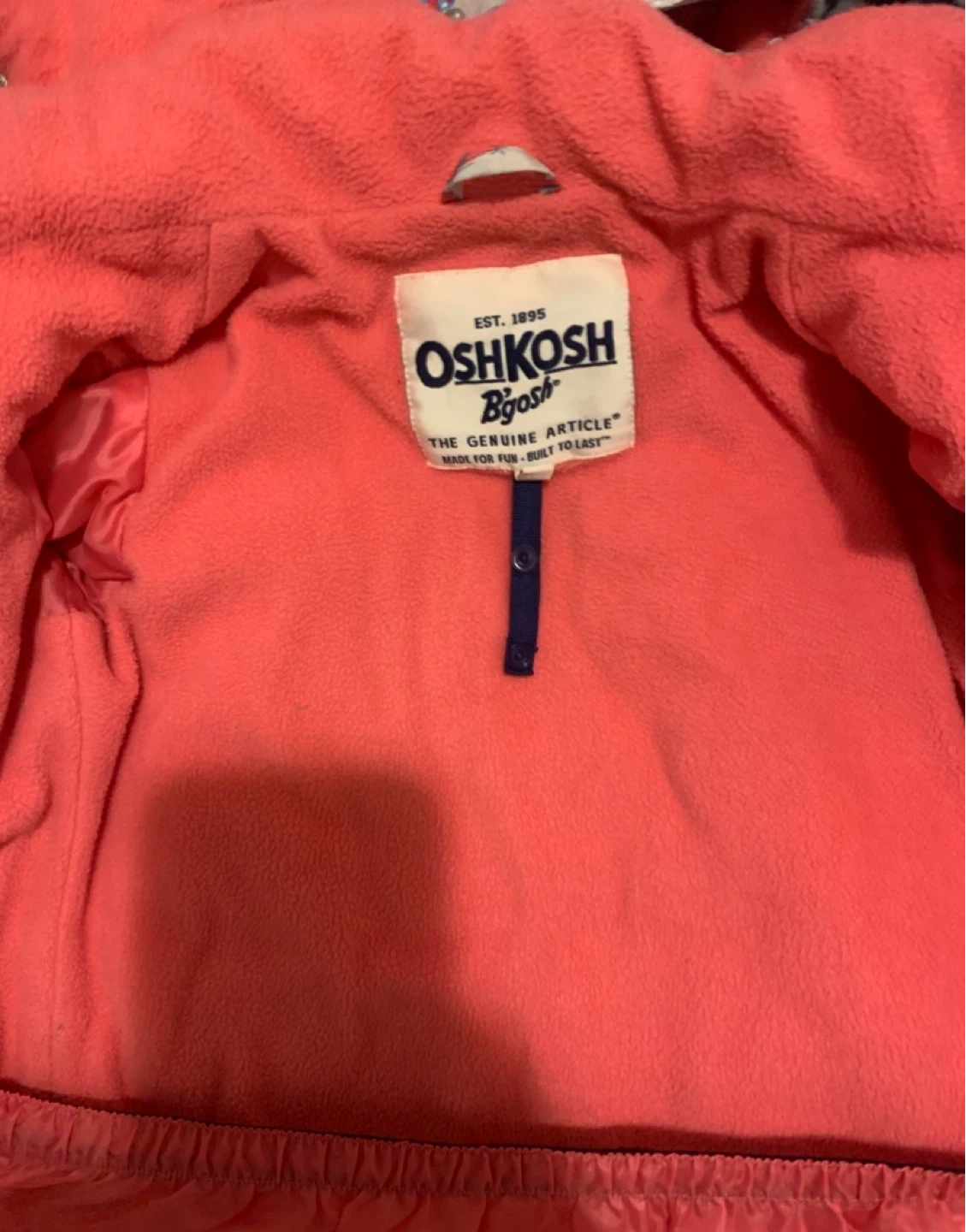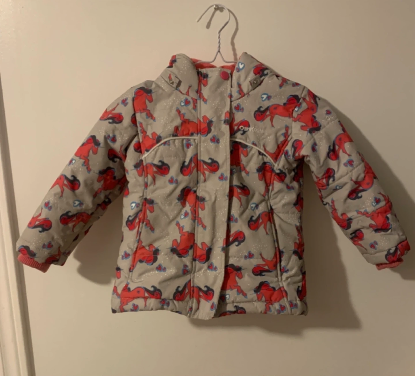 OshKosh B'gosh girls' puffer jacket with a fun horse print. Features a soft fleece lining for extra warmth. It's a cozy choice for cooler weather!