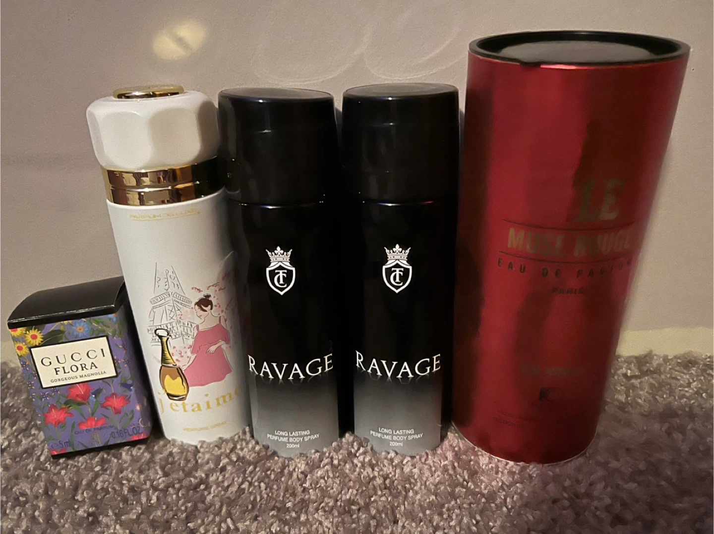 Bundle includes various perfumes, body sprays, and a lipstick. Items include Gucci Flora, Ravage body spray, Le Must Rouge Eau de Parfum, and Yves Saint Laurent Rouge Volupté lipstick. Also includes Christian Dior pouch and vanity case. Some opened not used. All brand new! Make an offer!