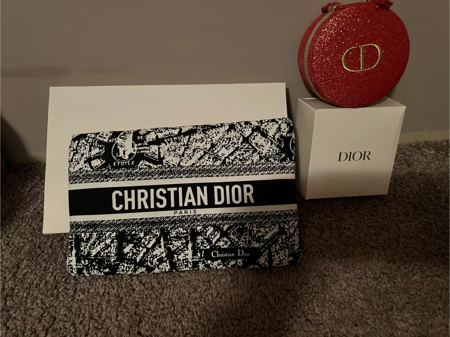 Bundle includes various perfumes, body sprays, and a lipstick. Items include Gucci Flora, Ravage body spray, Le Must Rouge Eau de Parfum, and Yves Saint Laurent Rouge Volupté lipstick. Also includes Christian Dior pouch and vanity case. Some opened not used. All brand new! Make an offer!