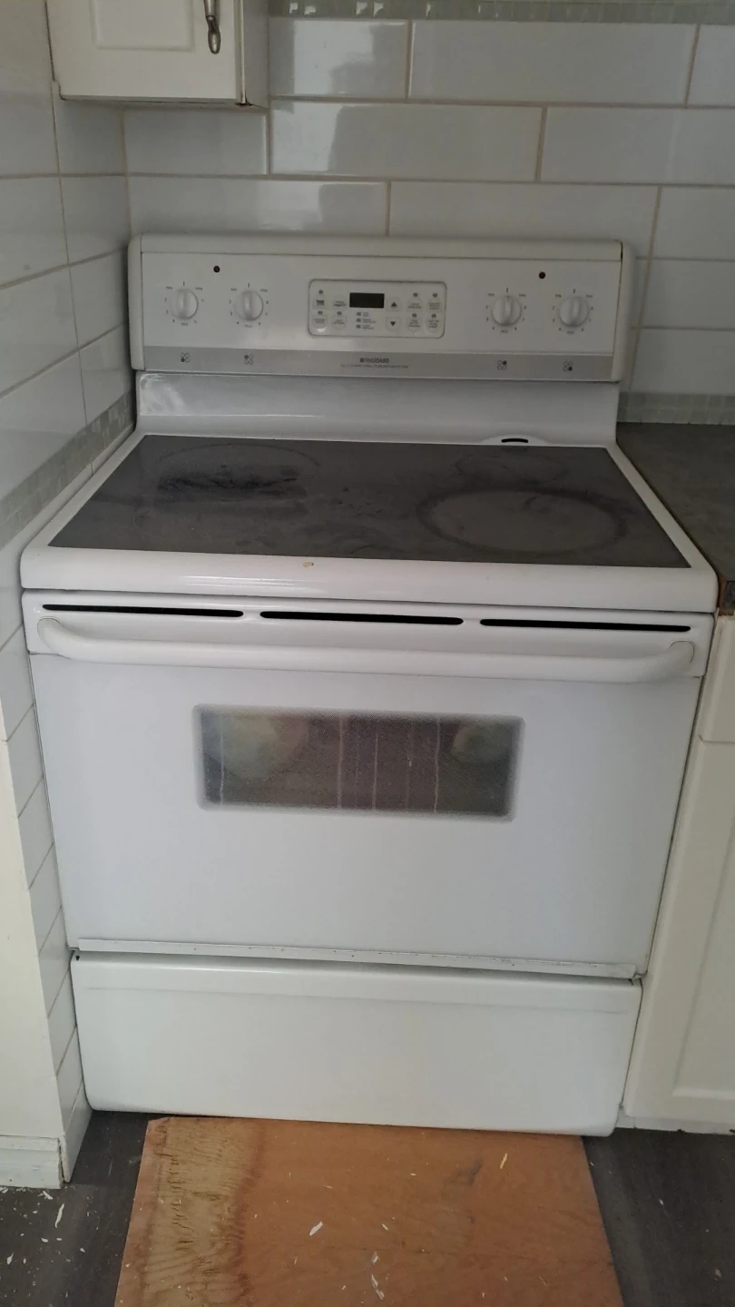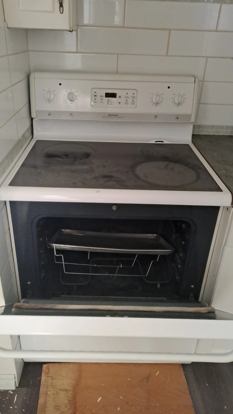 White electric stove with a four-burner smoothtop and a self-cleaning oven. Includes one baking sheet and oven rack. Ready to install and use!