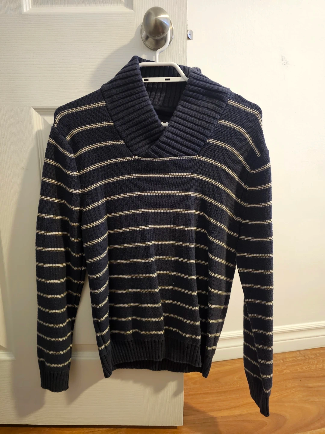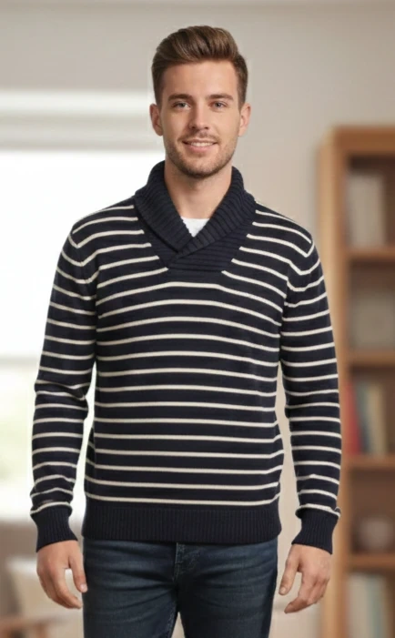 Navy and Cream Striped Shawl Collar Sweater