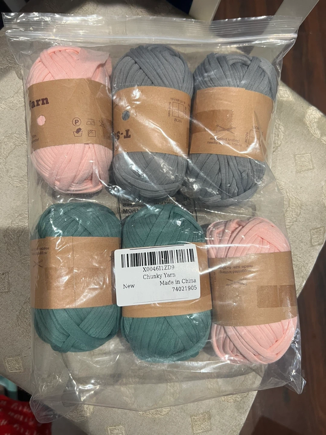 Set of 6 rolls of chunky t-shirt yarn. Includes pink, grey, and green colours. Each roll is 100g and approximately 30m long. Made from 100% polyester. Great for knitting or crochet projects!
