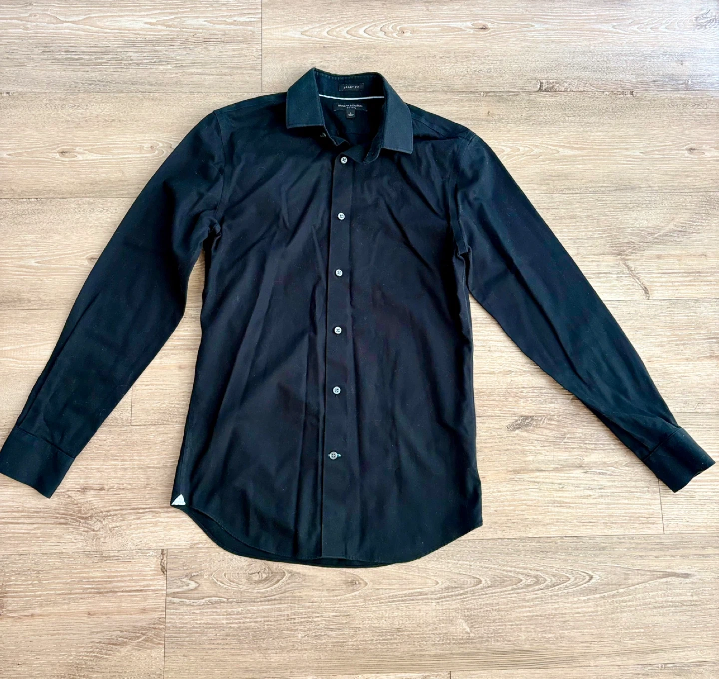 This is a Banana Republic non-iron dress shirt in black. It's a size small with a Grant Fit. Machine washable for easy care!