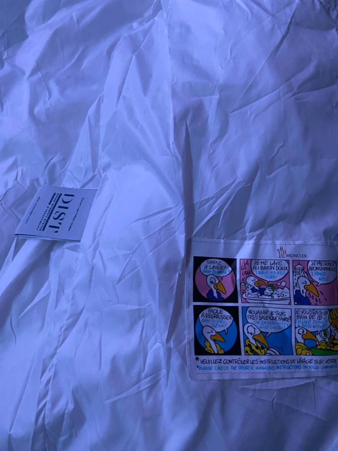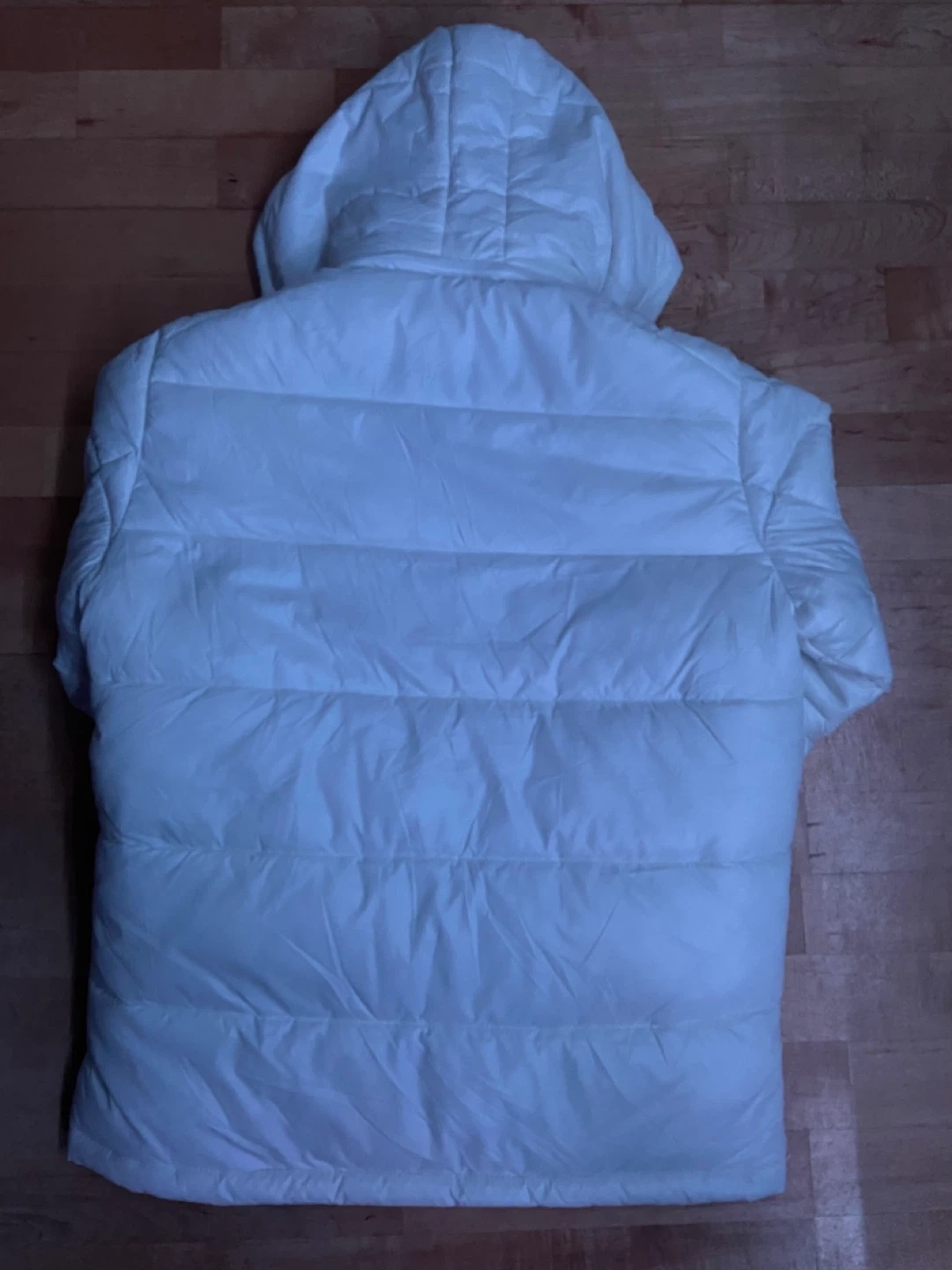 A stylish white puffer jacket from Moncler. It's a durable outerwear piece perfect for cooler weather. Material is down-filled for warmth.