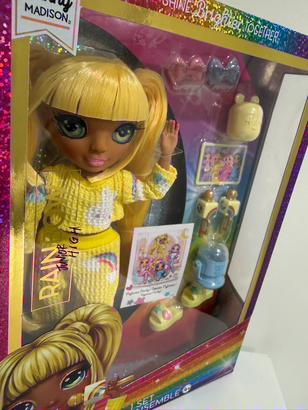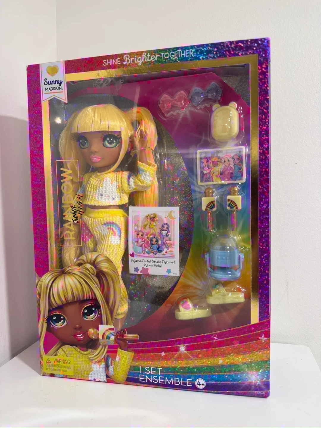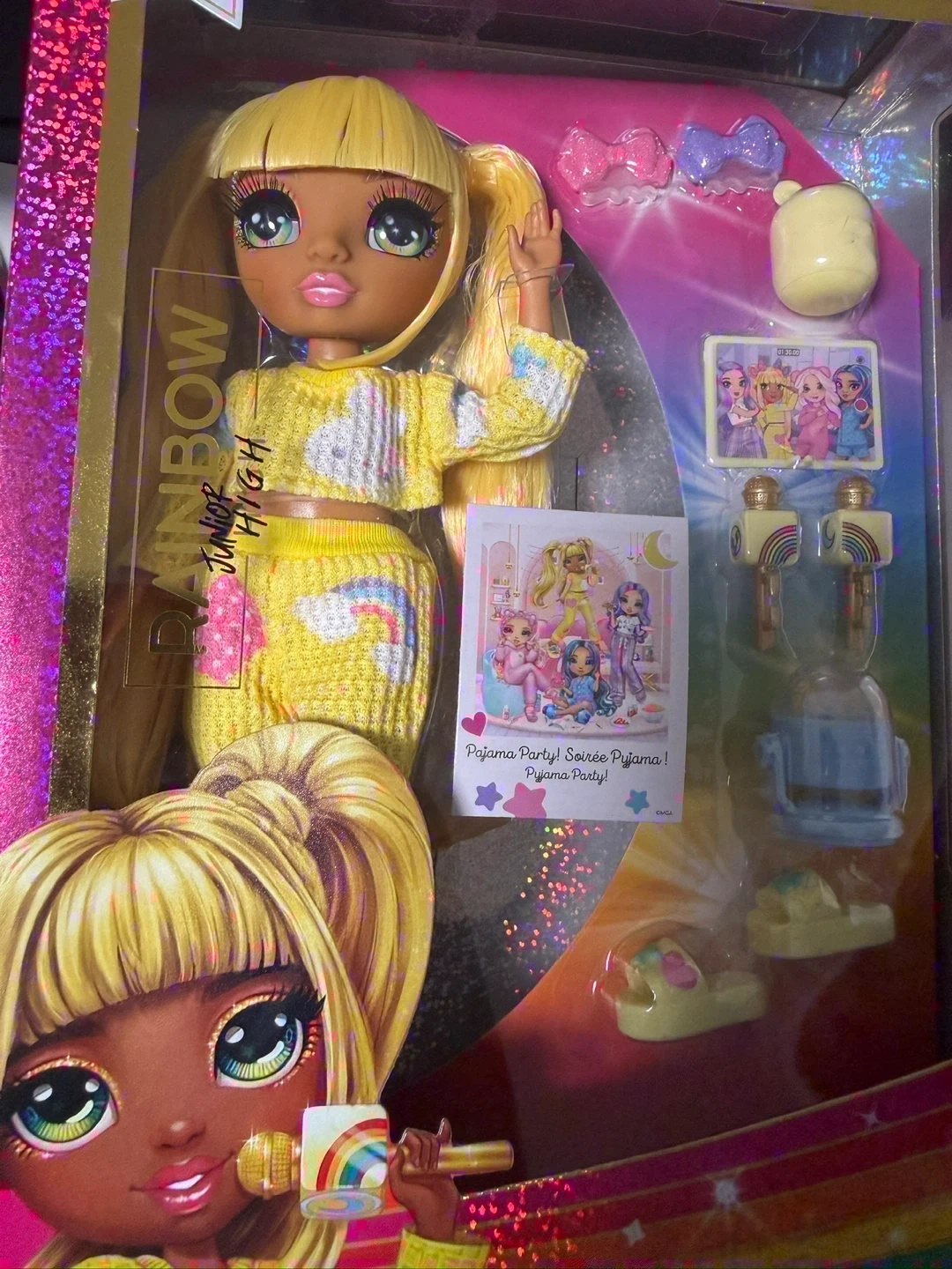 This Rainbow High Junior High doll features Sunny Madison in her pyjama party outfit. It comes with various accessories for a fun slumber party experience. Recommended for ages 4 and up.