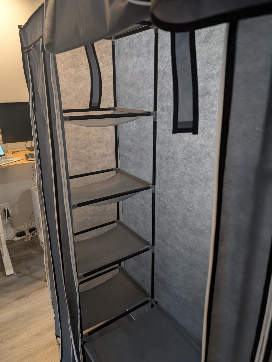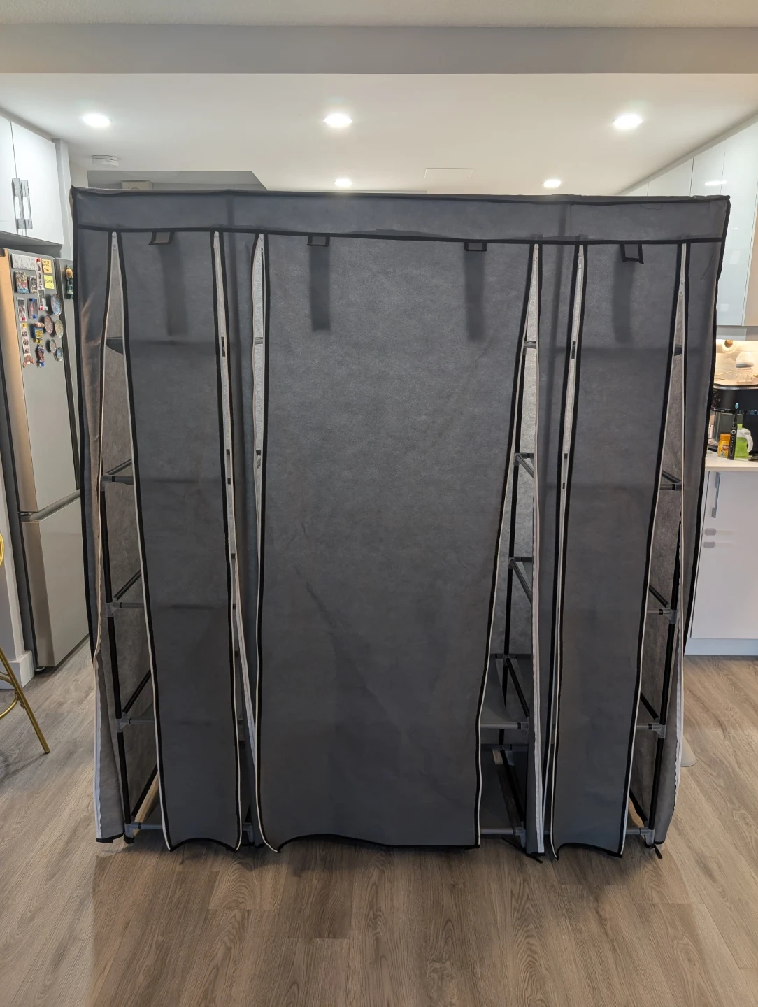 This portable wardrobe closet offers ample storage space. It's constructed with a sturdy metal frame and grey fabric cover. The interior features multiple shelves for organizing clothes and accessories. The front zippers allow for easy access and closure.