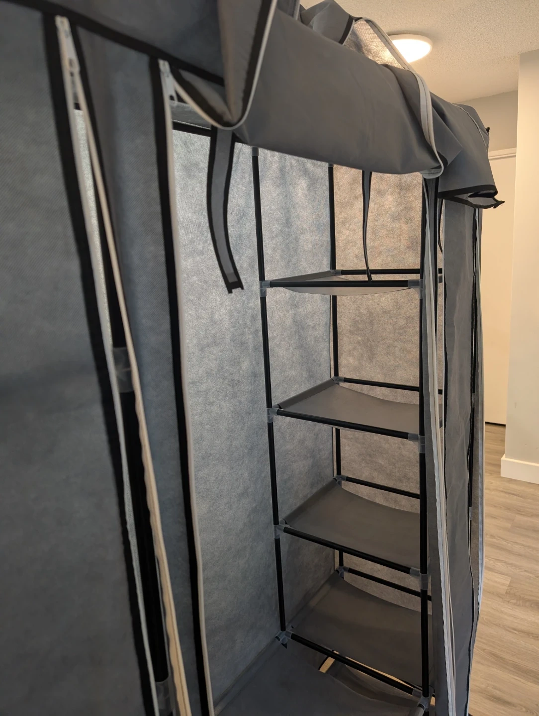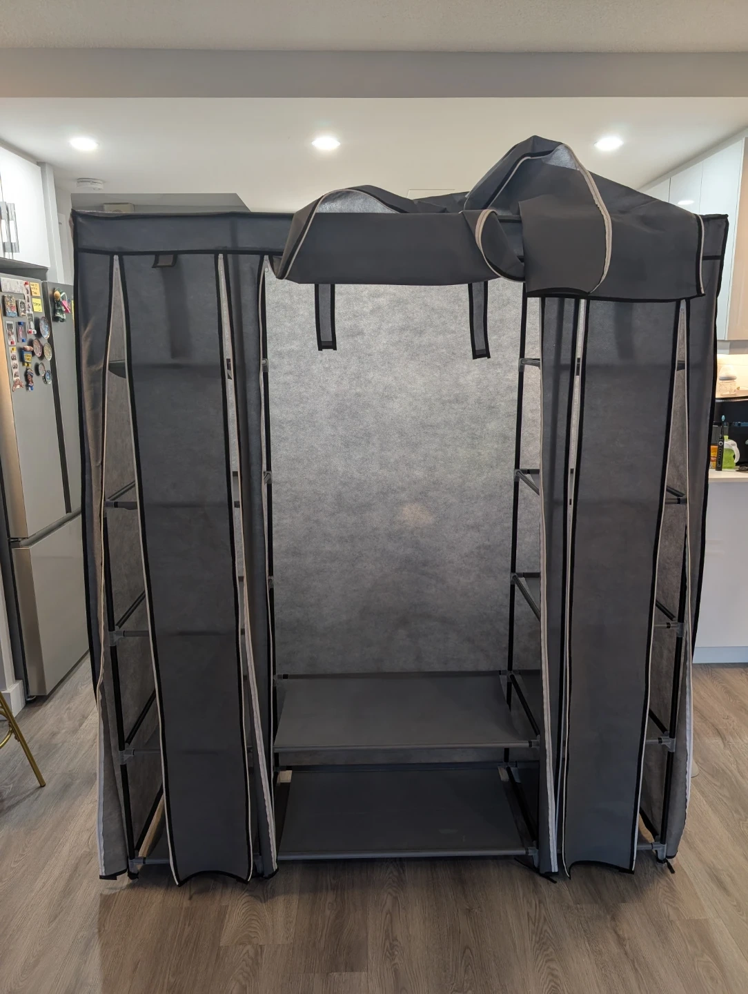 This portable wardrobe closet offers ample storage space. It's constructed with a sturdy metal frame and grey fabric cover. The interior features multiple shelves for organizing clothes and accessories. The front zippers allow for easy access and closure.
