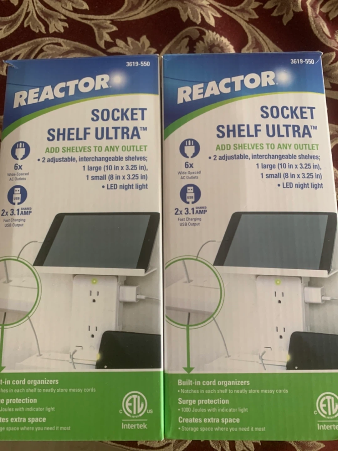 This Reactor Socket Shelf Ultra adds shelves to any outlet. It includes 6 wide-spaced AC outlets and 2x 3.1A USB fast charging ports. It also features built-in cord organizers and surge protection with 1000 Joules and an indicator light.