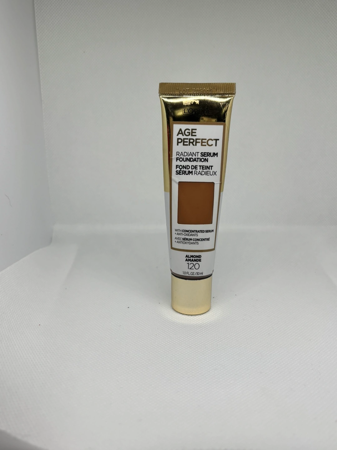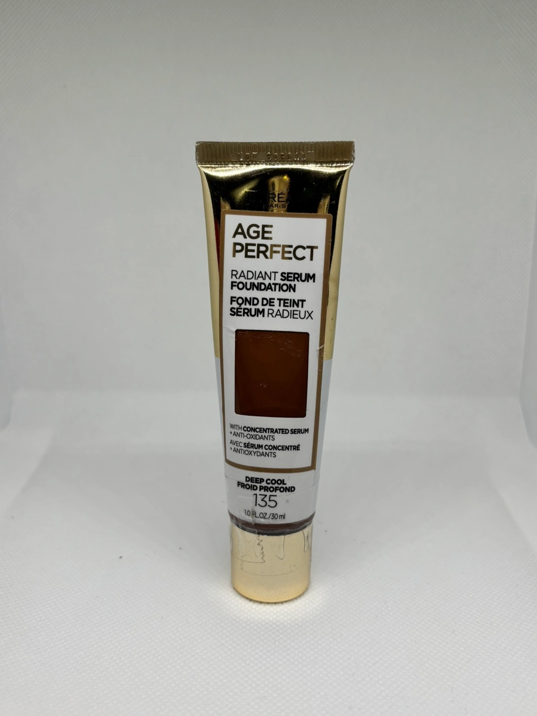 The item is a radiant serum foundation in a gold tube. It has a brown-toned hue that is visible from the clear window. You will love how the product looks on your face after application.