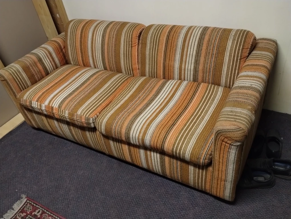 Here's a comfy loveseat sofa with a retro striped pattern! It's in good condition and perfect for a small space or cozy living room. THIS IS HIDE A BED. $ 190 please call 403 585 9440