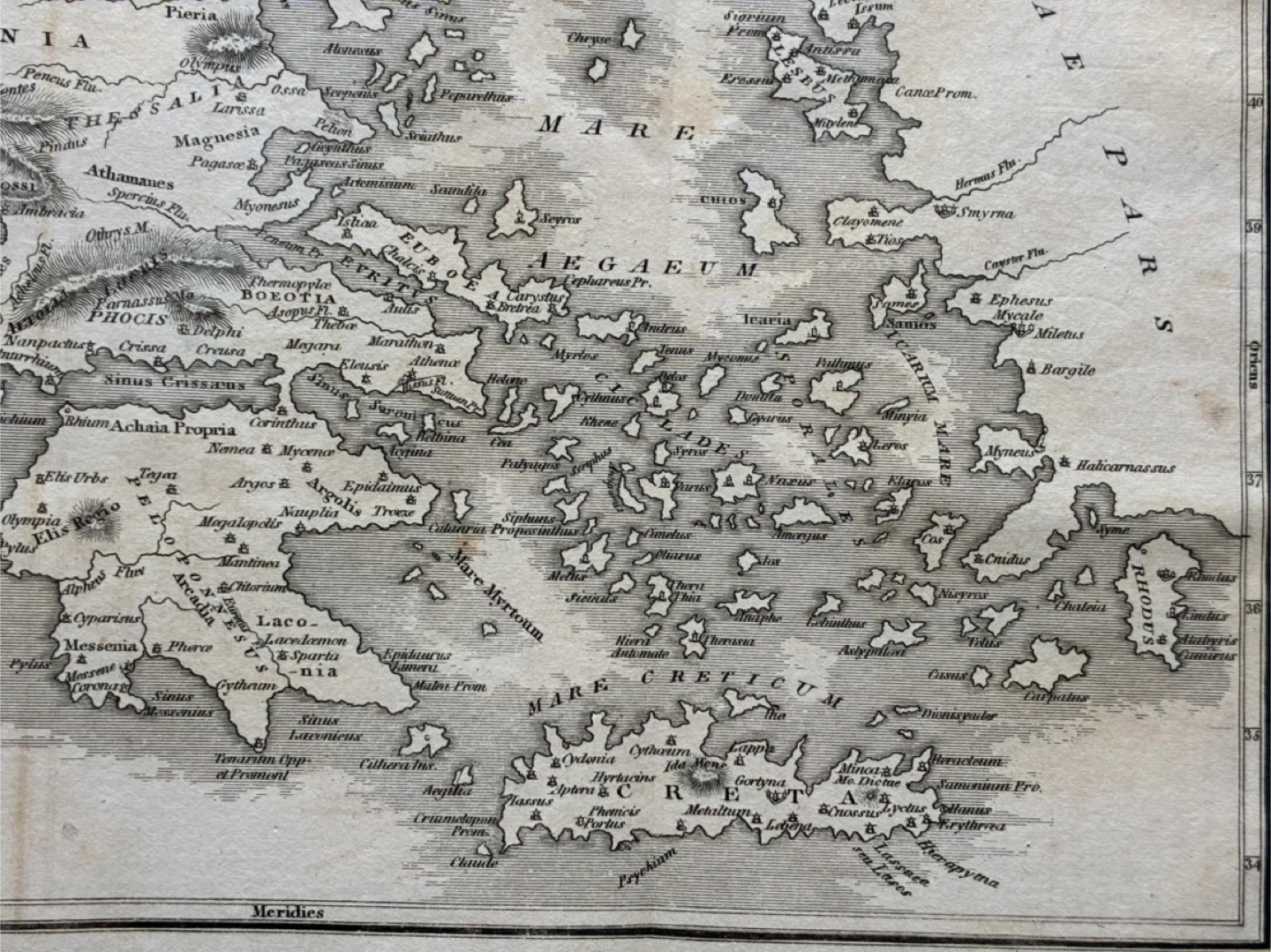 uncoloured copper-engraving map of Greece, Ionian & Aegean islands Macedonia and Albania and Asia Minor Crete Greek islands Peloponnesus