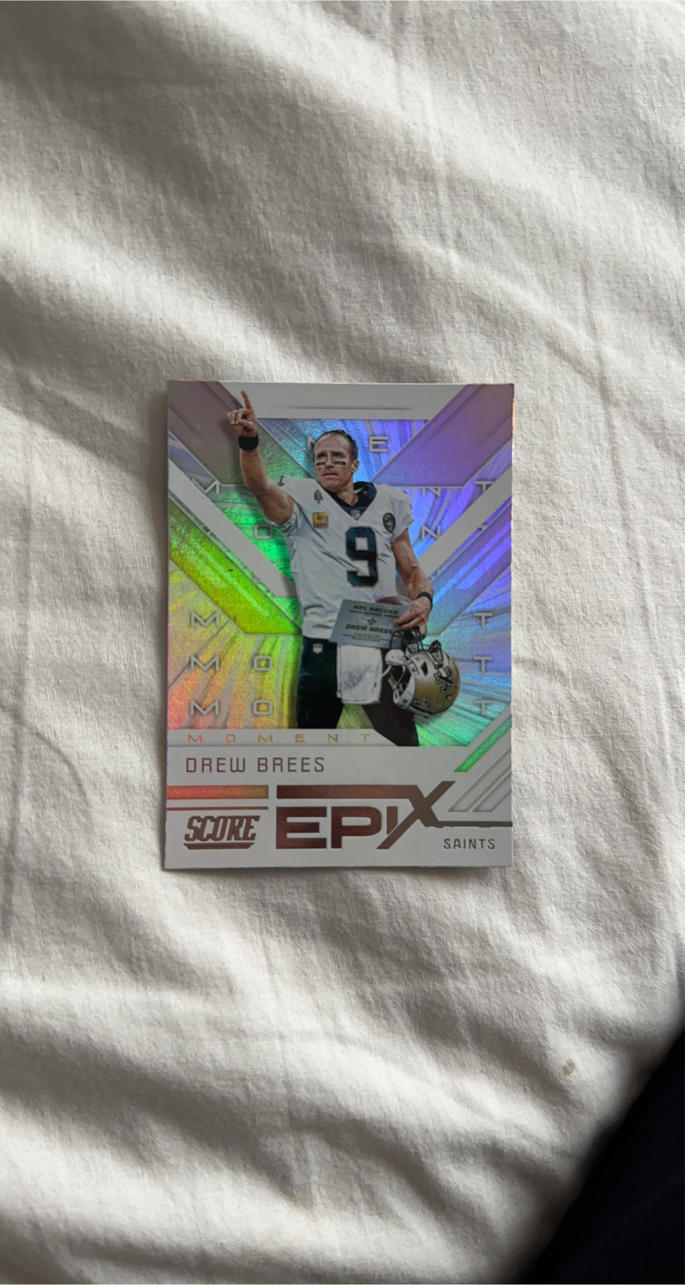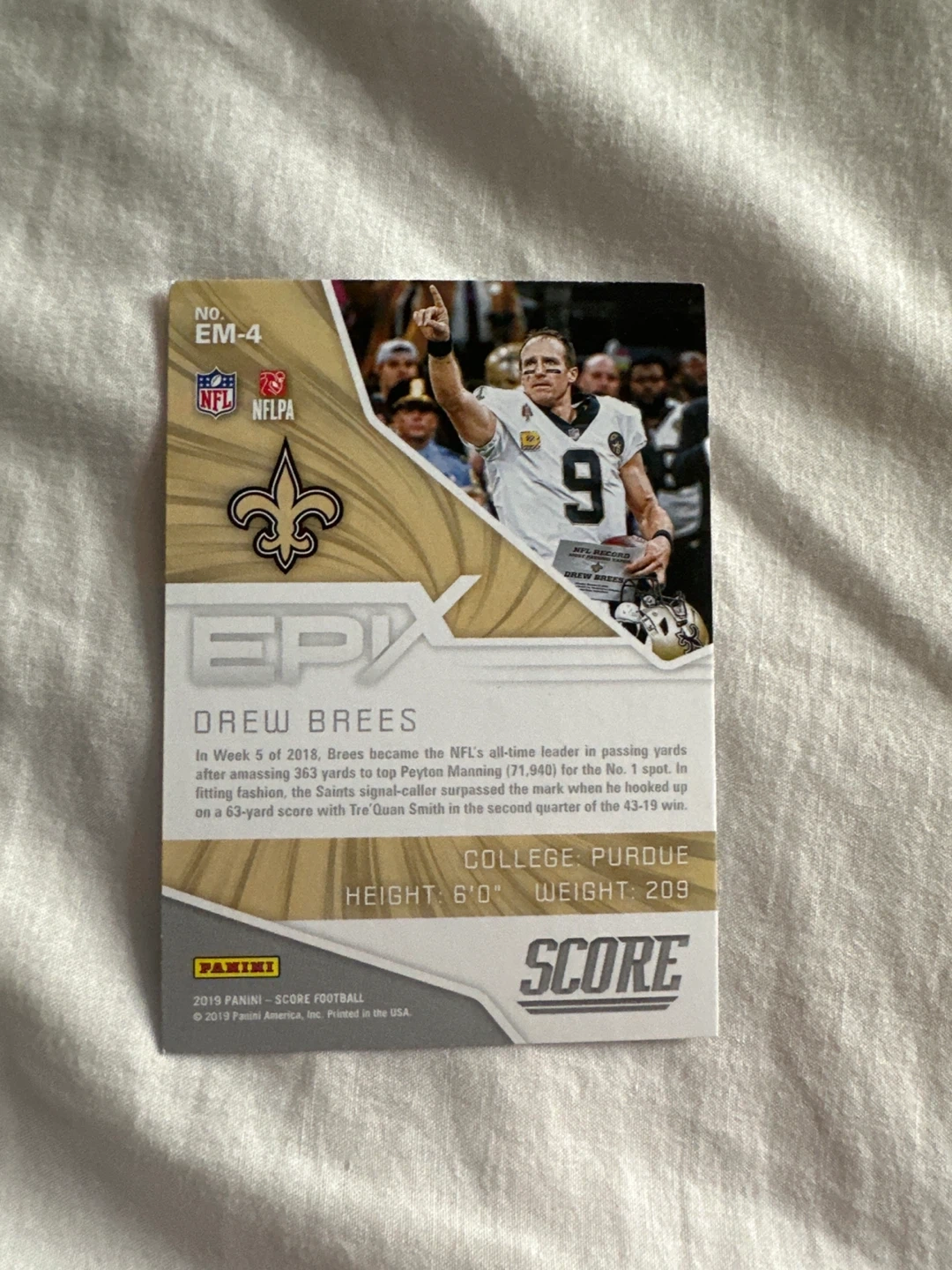 This is a 2019 Panini Score football card featuring Drew Brees. It highlights his achievement of becoming the NFL's all-time leader in passing yards. The card measures 6'0" in height and weighs 209 lbs.