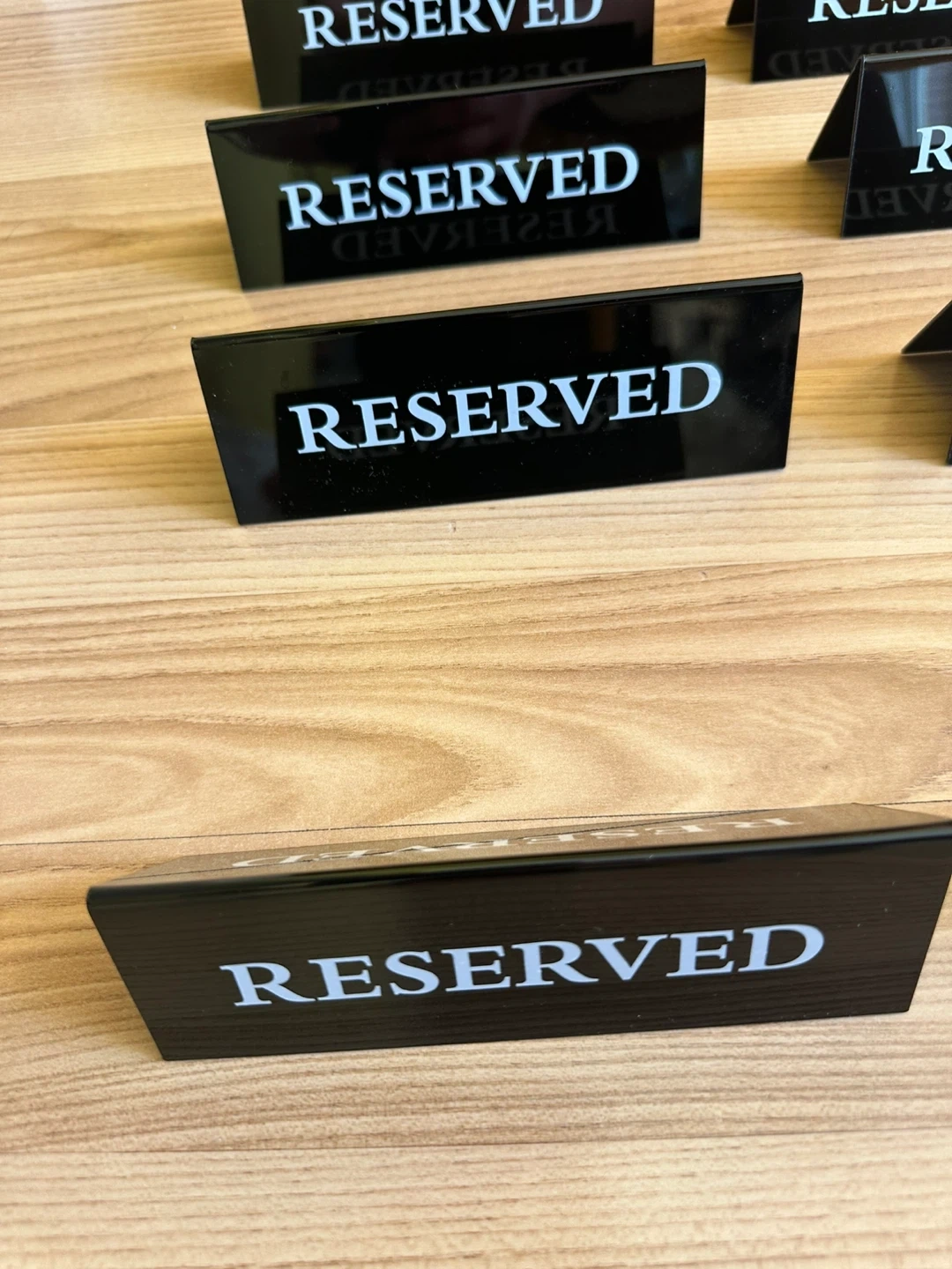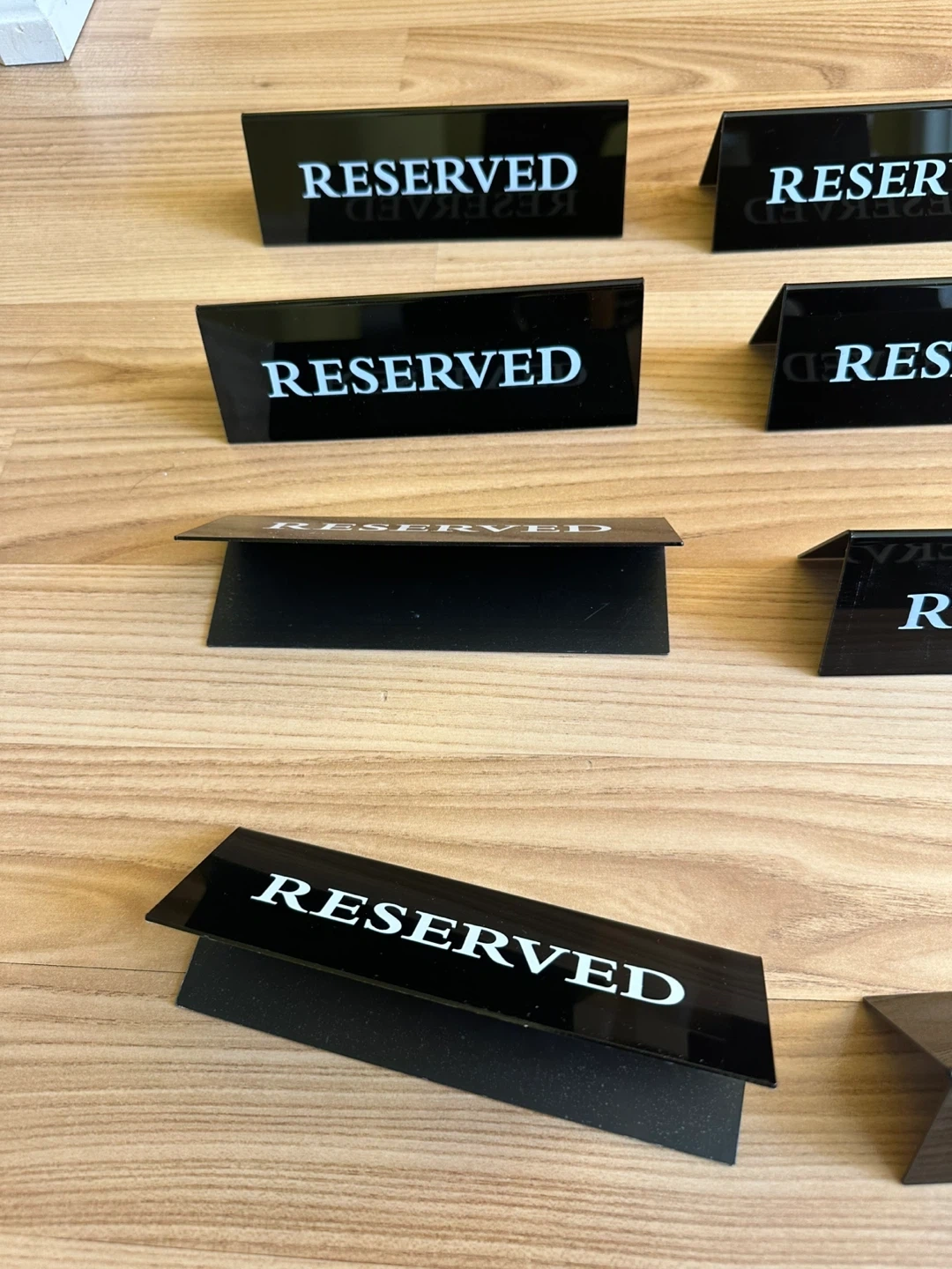 This is a set of 8 black table signs with "RESERVED" printed in white. They're made of a durable material and stand upright on their own. Perfect for marking tables at events or in restaurants.