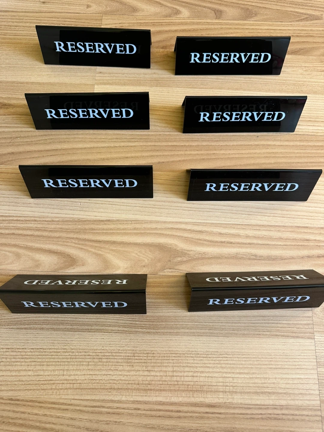 This is a set of 8 black table signs with "RESERVED" printed in white. They're made of a durable material and stand upright on their own. Perfect for marking tables at events or in restaurants.