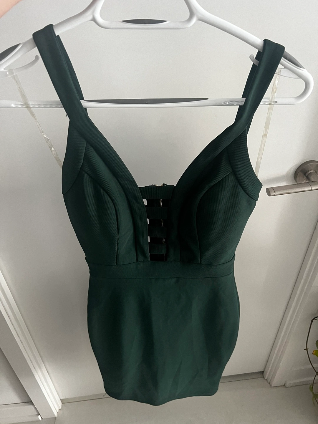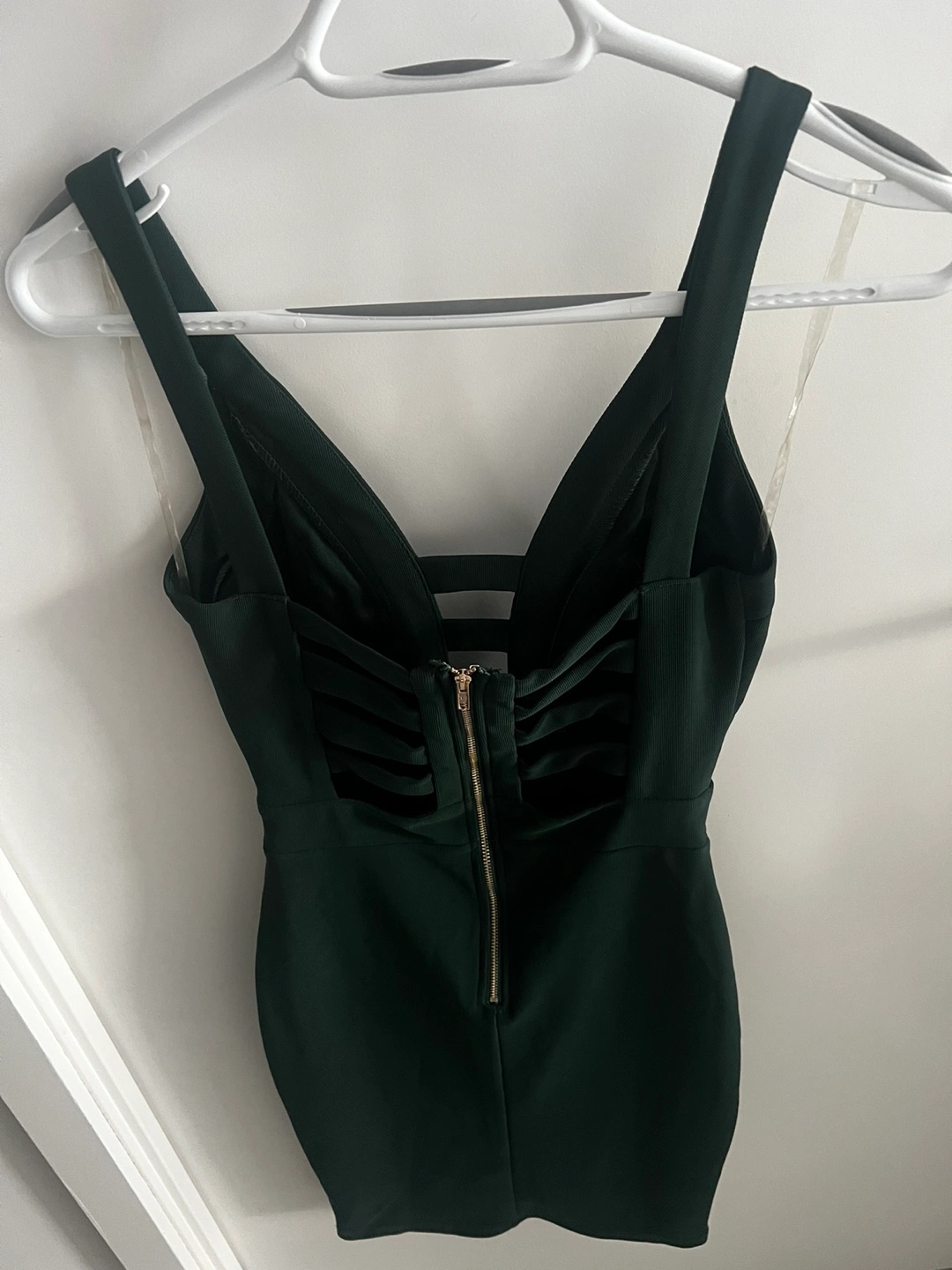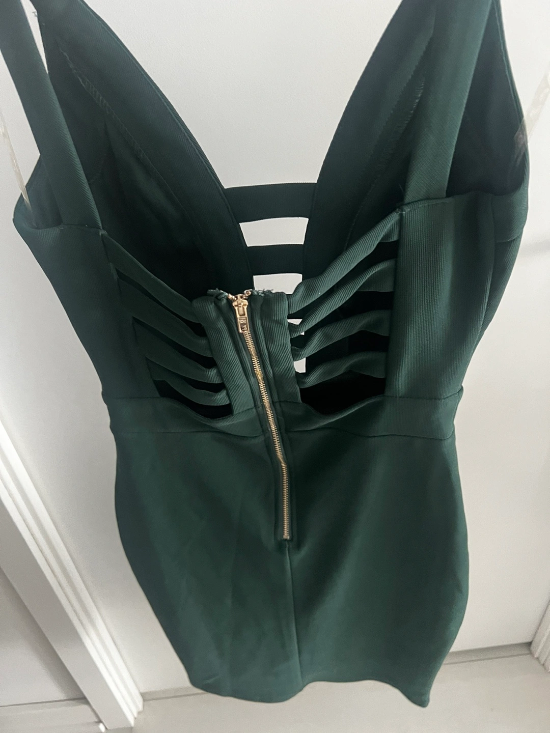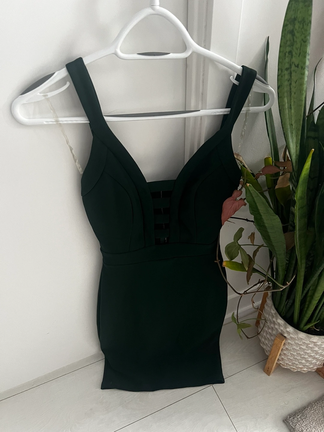 Dark green mini dress. Features a V-neckline and cut-out detailing at the back. Back zipper closure. Spaghetti straps. Fits beautiful! Brand new. Never worn.