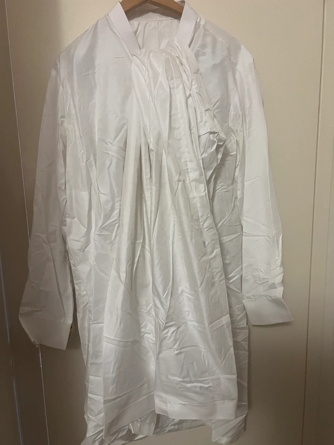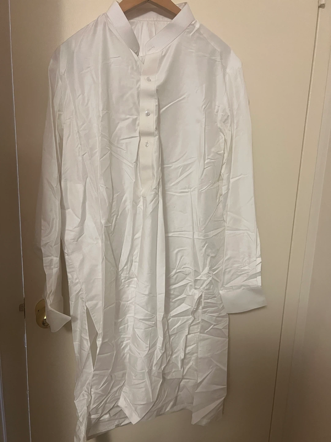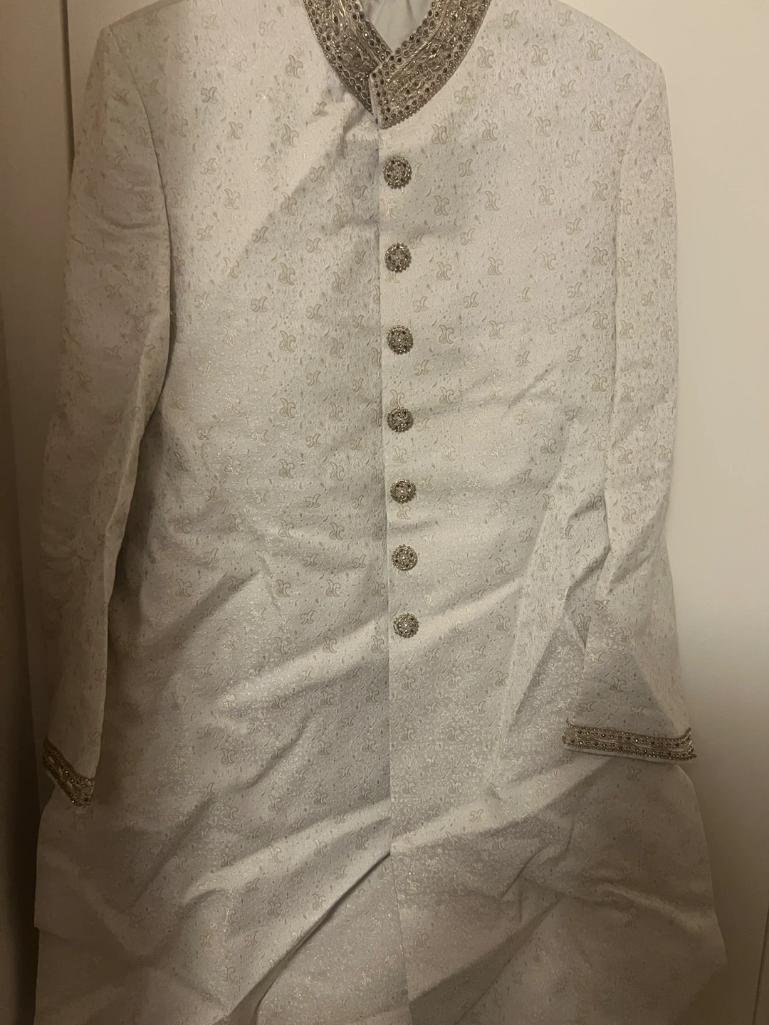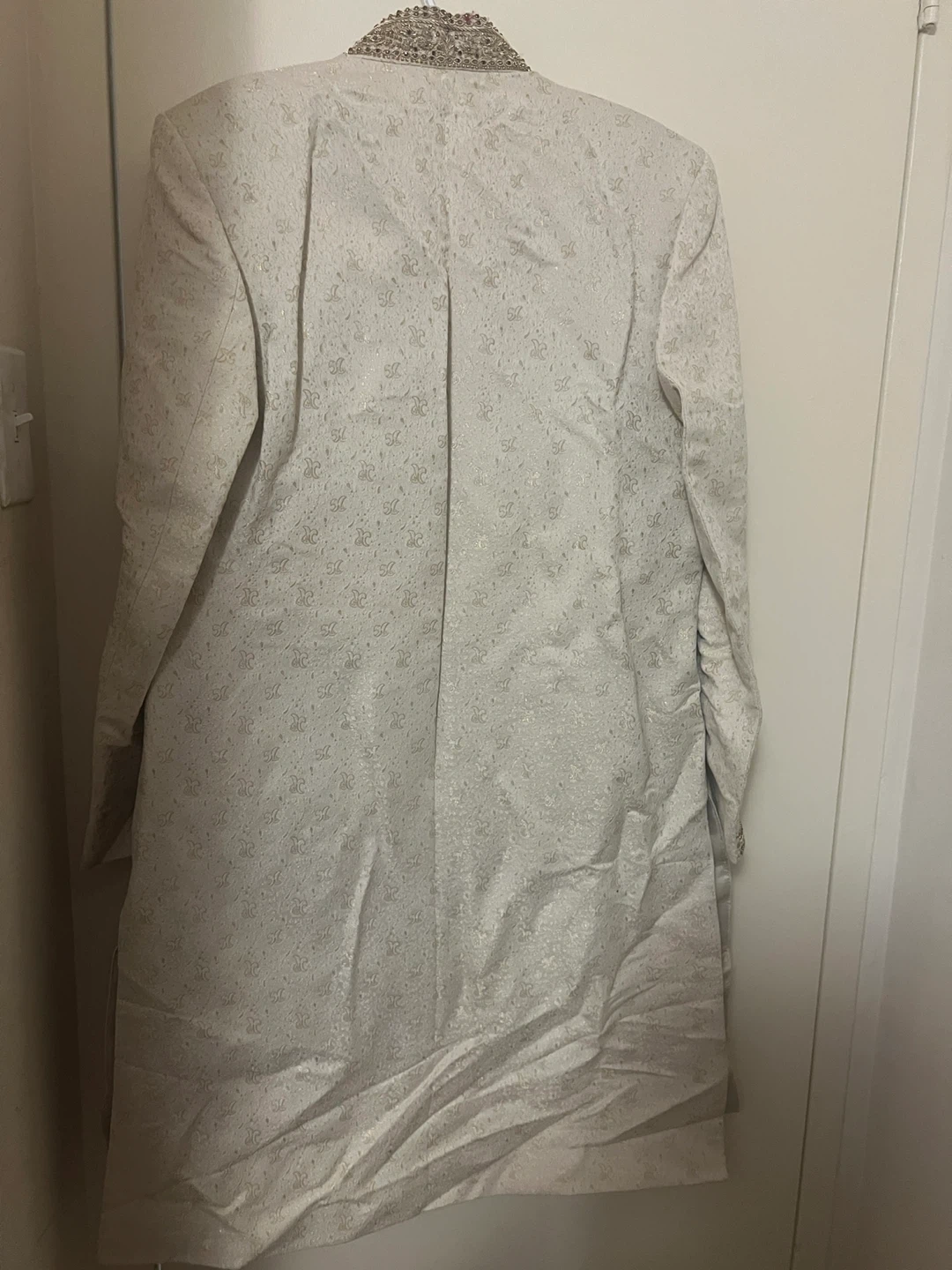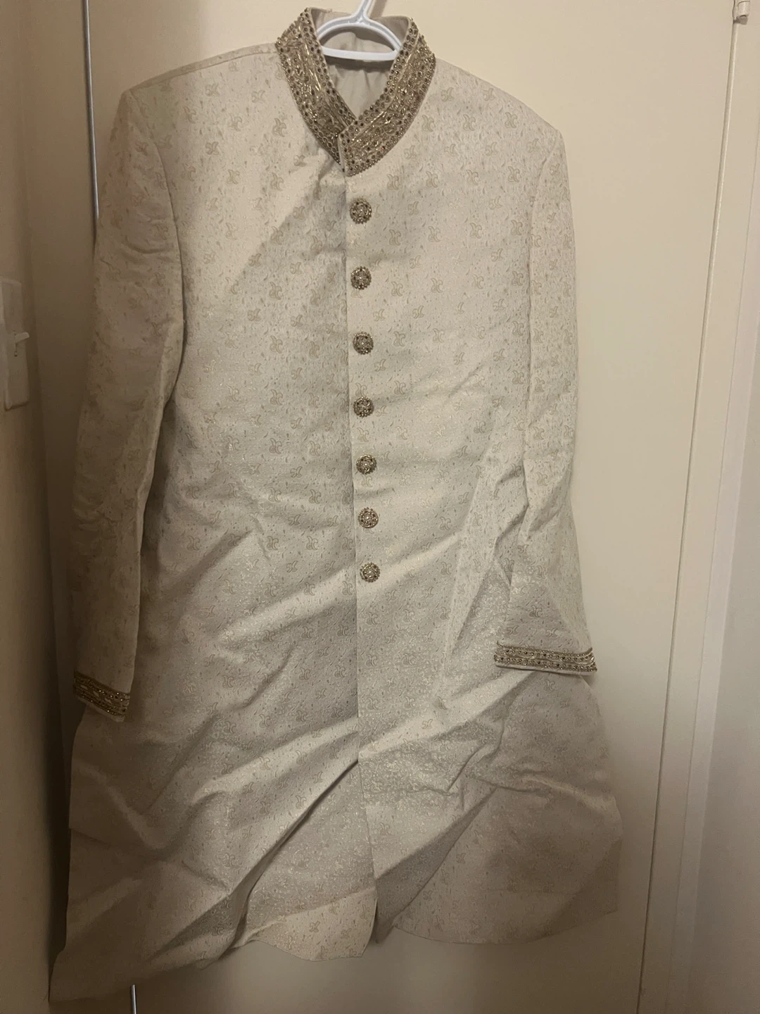 Elegant white sherwani featuring intricate gold-tone embroidery on the collar and cuffs. It comes with a matching white inner kurta. Perfect for special occasions!