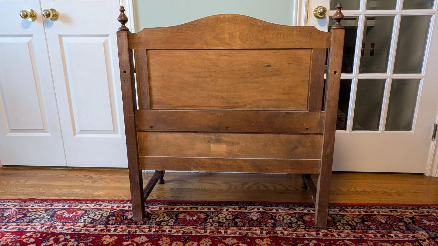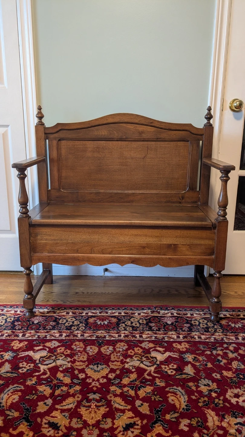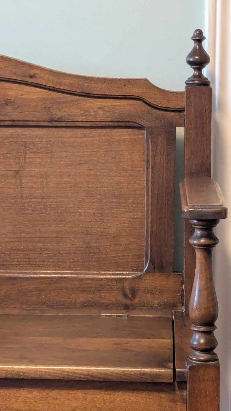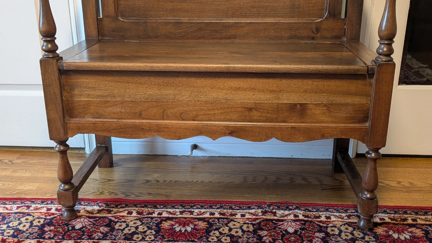 This antique hallway bench is crafted from rich, dark wood. It features a hinged seat for convenient storage and a decorative carved apron. Its classic design makes it a great addition to any entryway or mudroom. Perfect for stashing boots, scarves, or bags!