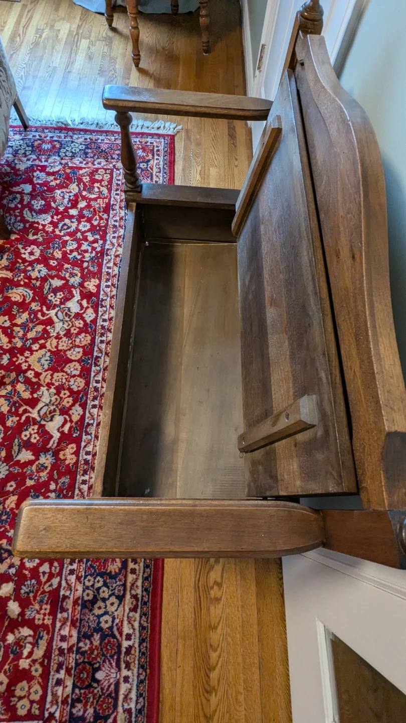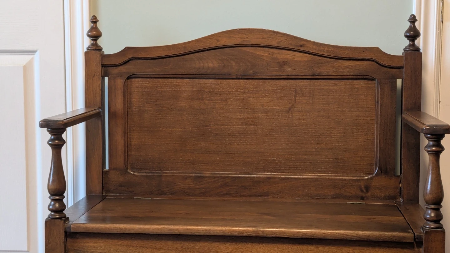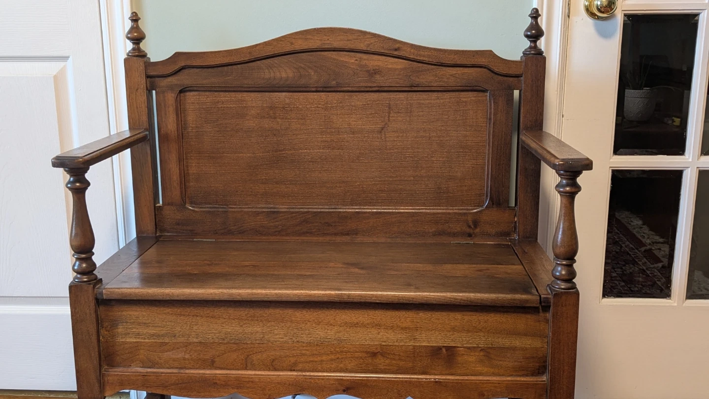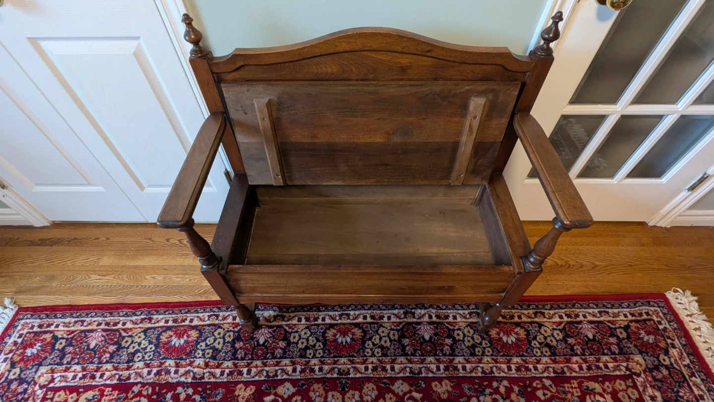 This antique hallway bench is crafted from rich, dark wood. It features a hinged seat for convenient storage and a decorative carved apron. Its classic design makes it a great addition to any entryway or mudroom. Perfect for stashing boots, scarves, or bags!