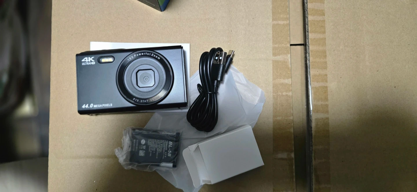 A 4K Ultra HD digital camera with 44.0 megapixels and 10x powerful zoom. It includes a battery and charging cable. Captures clear photos and videos!