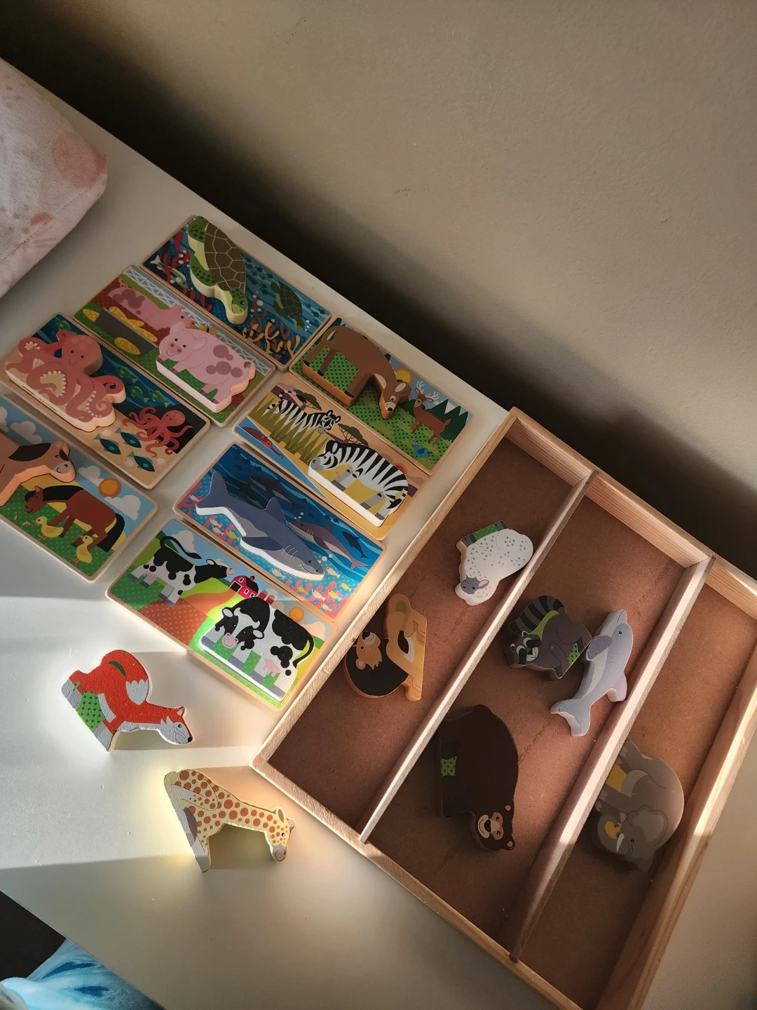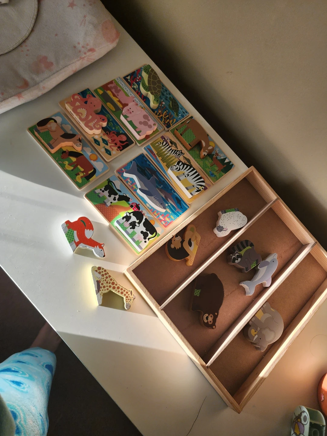 This set includes multiple wooden puzzles with various animals. Each puzzle features bright colors and detailed illustrations. It's a great way for young children to learn about different animals!