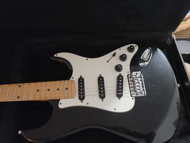 For sale is a Kramer guitar, a sleek black model with a maple neck, showcasing its rock-and-roll heritage. This guitar is in used condition, ready to plug in and shred. It remains fully functional and eager to make music once again. Brand: Kramer, Model: Authentic, Colour: Black, Neck: Maple. If you see this ad, the guitar is still available, so don't miss your chance to own a piece of rock history. Cash accepted.