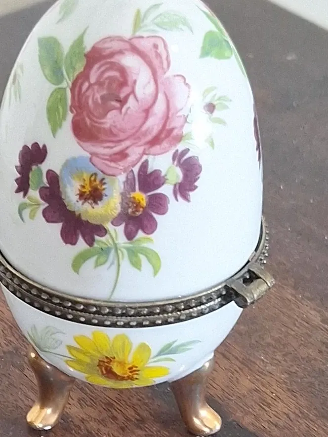 White porcelain egg-shaped trinket box with a hinged lid. Features hand-painted floral designs, including roses and daisies. It's supported by three small decorative legs.