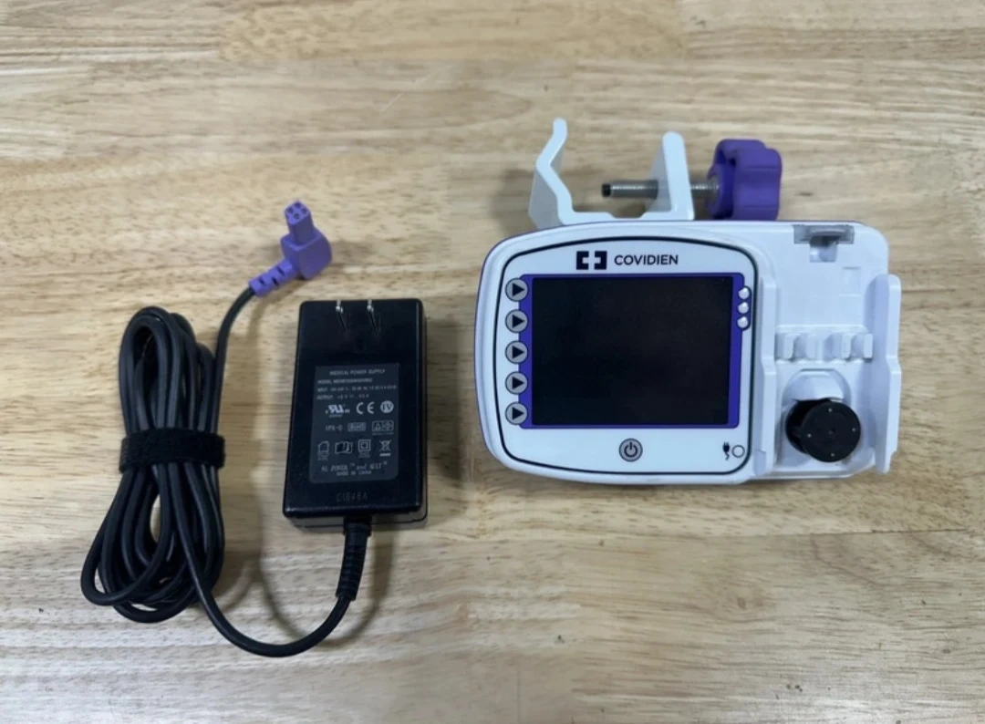 This is a Covidien Kangaroo Connect Enteral Feeding Pump. It's a medical device for administering liquid nutrition. Includes pump, clamp, and power adapter.
