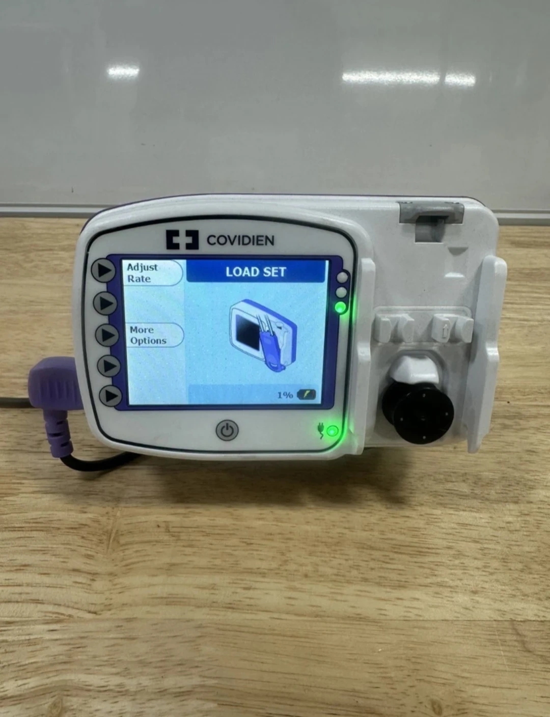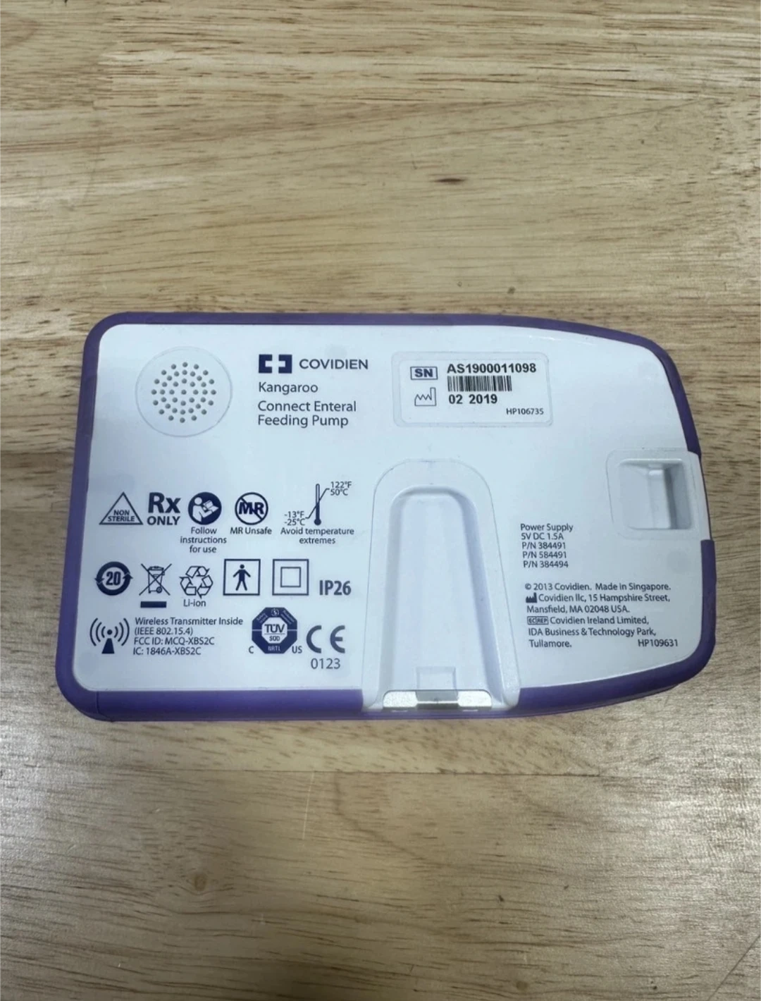 This is a Covidien Kangaroo Connect Enteral Feeding Pump. It's a medical device for administering liquid nutrition. Includes pump, clamp, and power adapter.