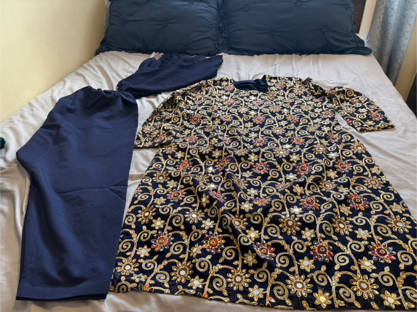 Beautiful floral embroidered dress and pants set in navy blue. Perfect for a special occasion or a stylish everyday look. In great condition!