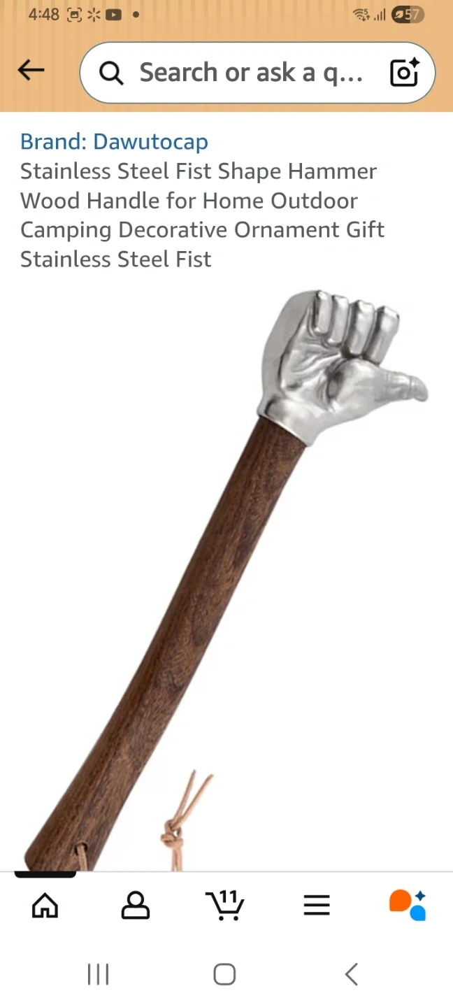 This unique hammer features a stainless steel fist head and a wooden handle. It's great for DIY crafting or as a decorative piece. The unique design makes it a cool conversation starter! Prices showing are Amazon prices I'm selling for less. Extremely heavy extremely well made you'll be impressed have many people using it on the job site.