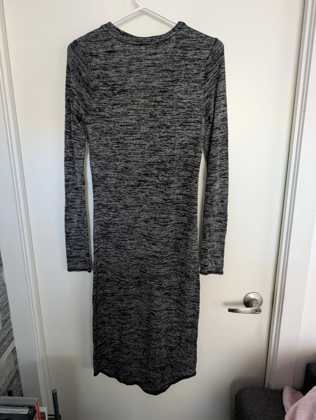 This gorgeous Wilfred Free dress features a marled grey knit with a V-neck and long sleeves. It's a fitted midi-length style. Great for layering or wearing on its own! Super soft and lightweight fabric.