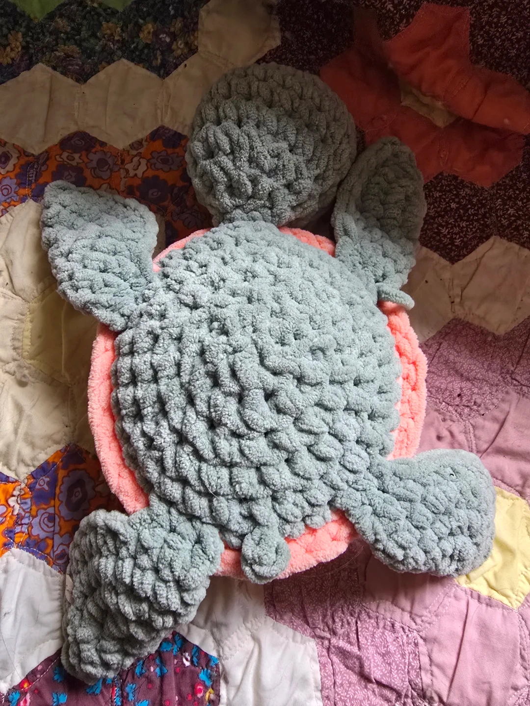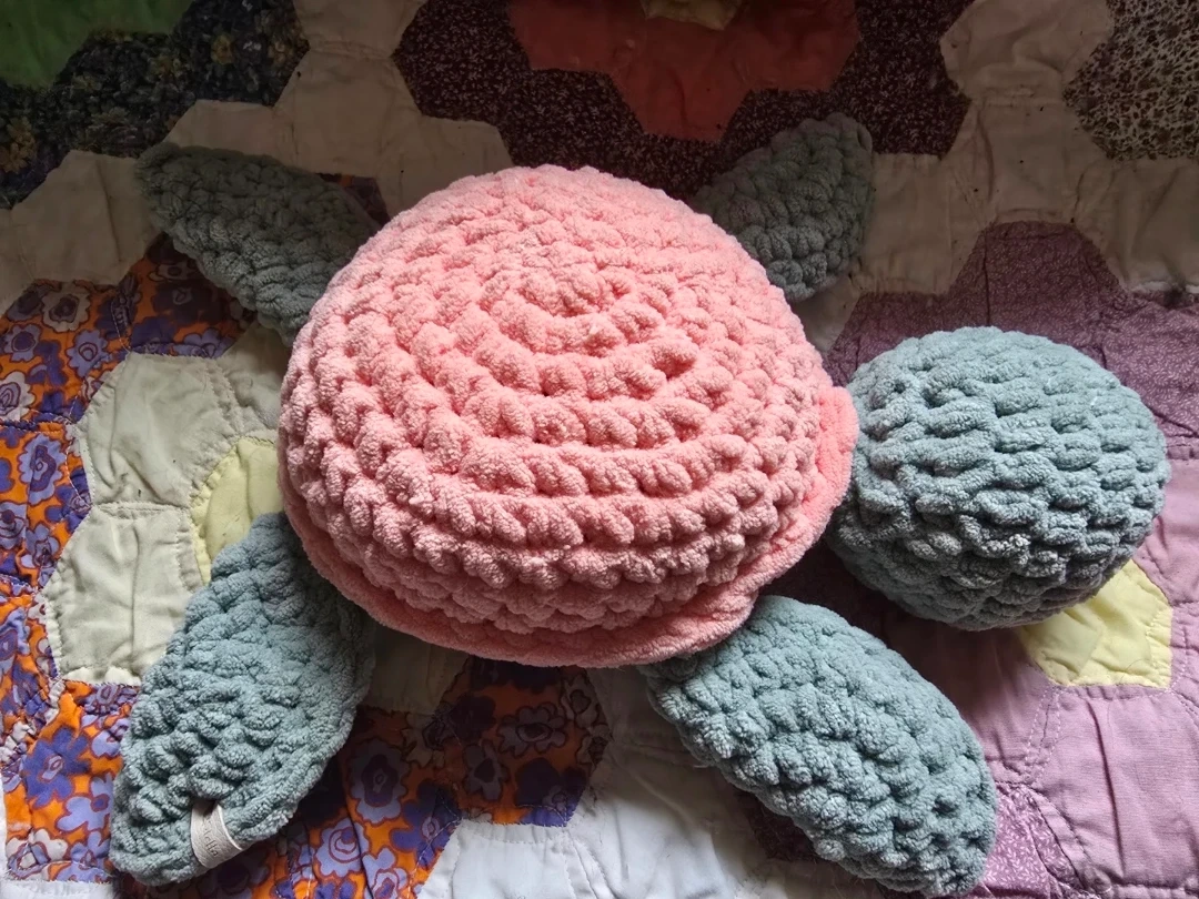 Crochet pink and green turtle plushie/stuffie. Handmade (not by me)