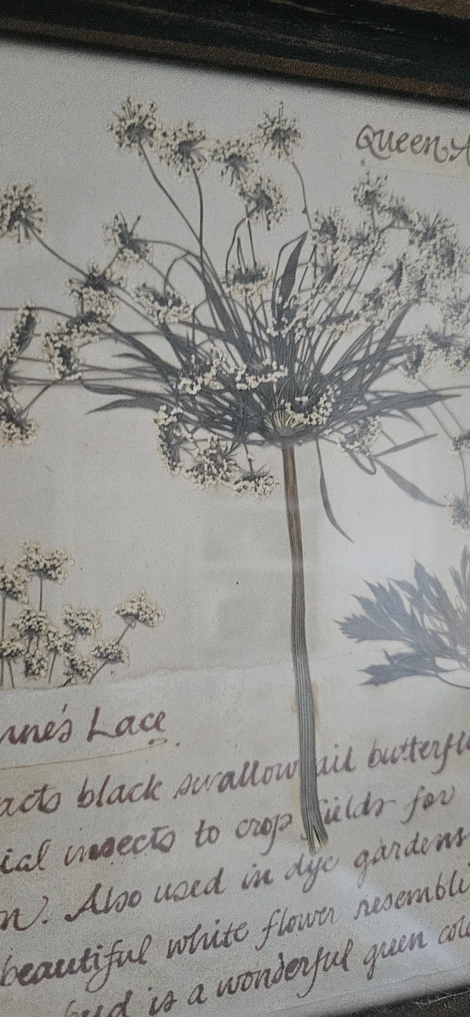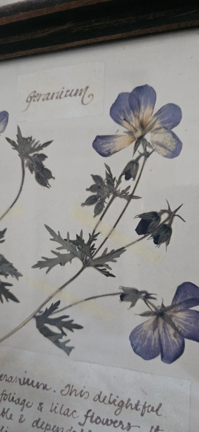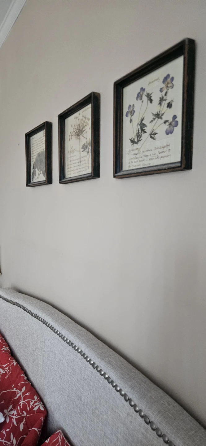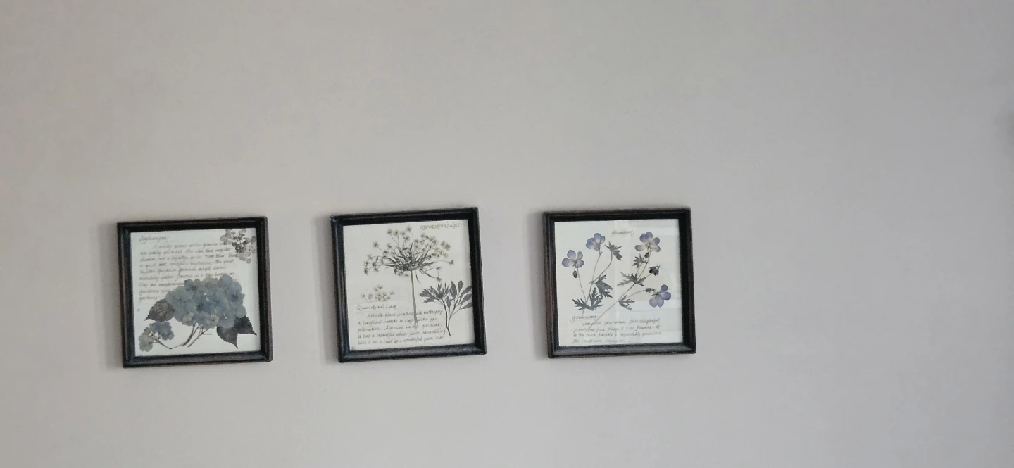 Set of three framed botanical prints featuring dried flowers. Includes Hydrangea, Queen Anne's Lace, and Geranium. Each print has descriptive text.