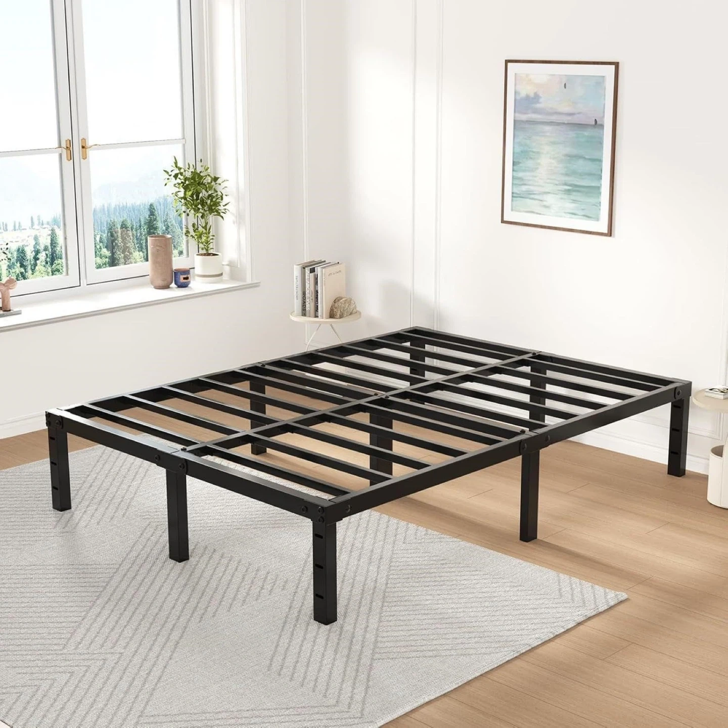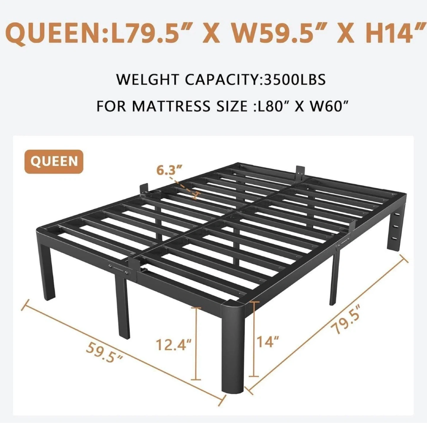Queen size metal bed frame, L79.5" x W59.5" x H14". Weight capacity is 3500lbs. Designed for mattress size L80" x W60". Provides sturdy support for your mattress.